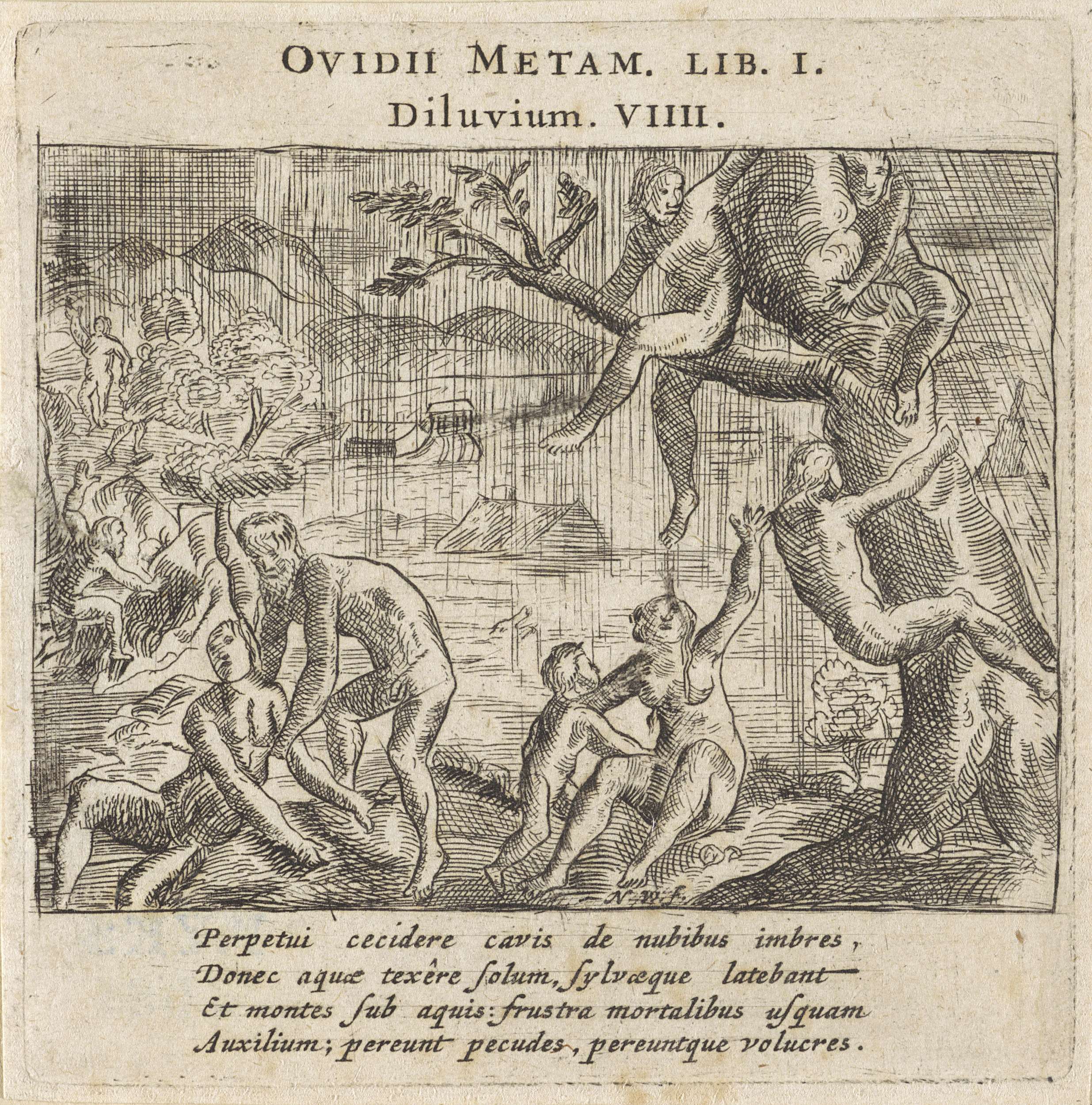 Naakte mensen vluchten voor het stijgende water van de zondvloed die door Jupiter is gestuurd. Onder de voorstelling een vierregelige toelichting in het Latijn.