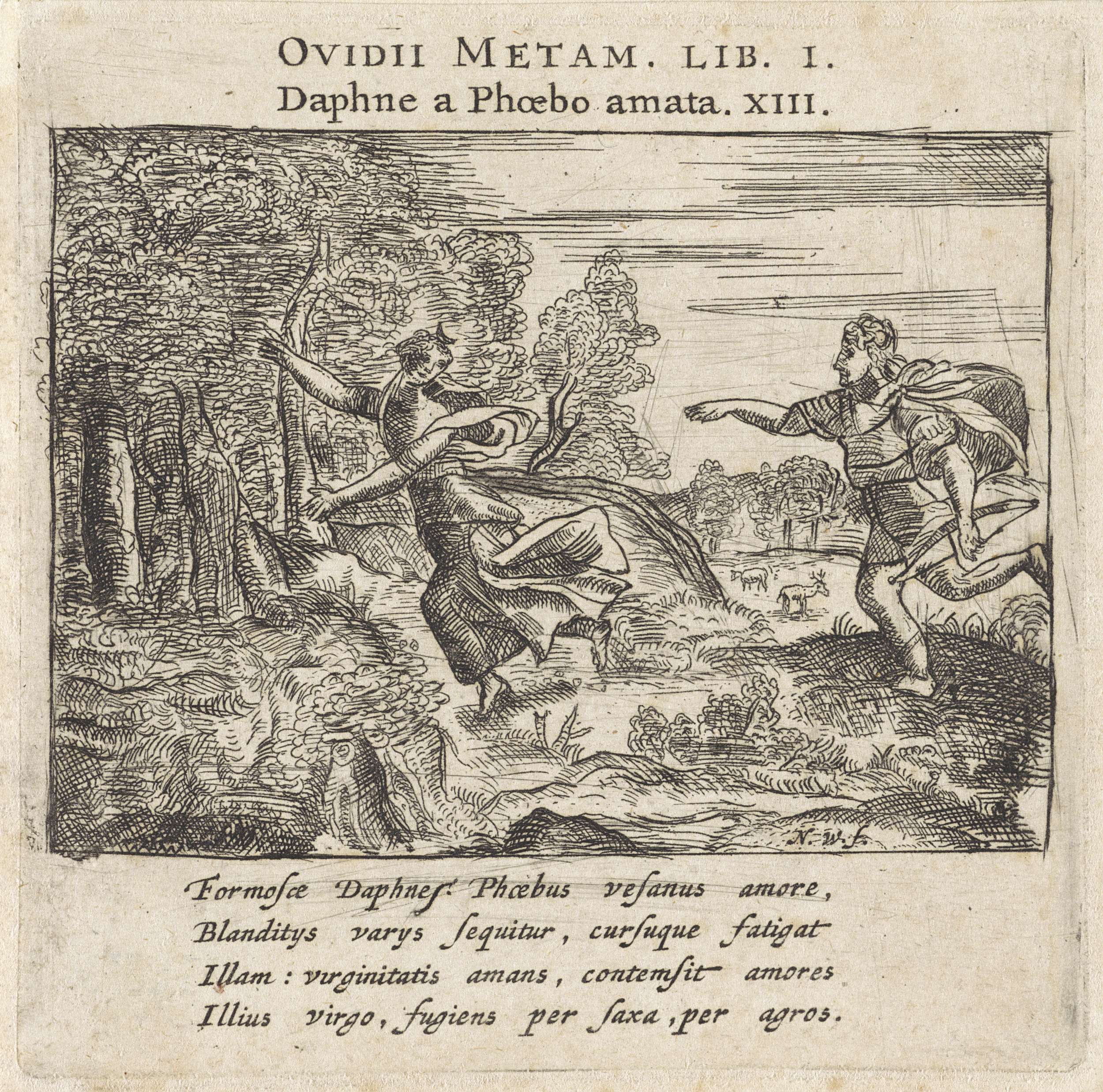 Apollo achtervolgt Daphne in een landschap. Onder de voorstelling een vierregelige toelichting in het Latijn.