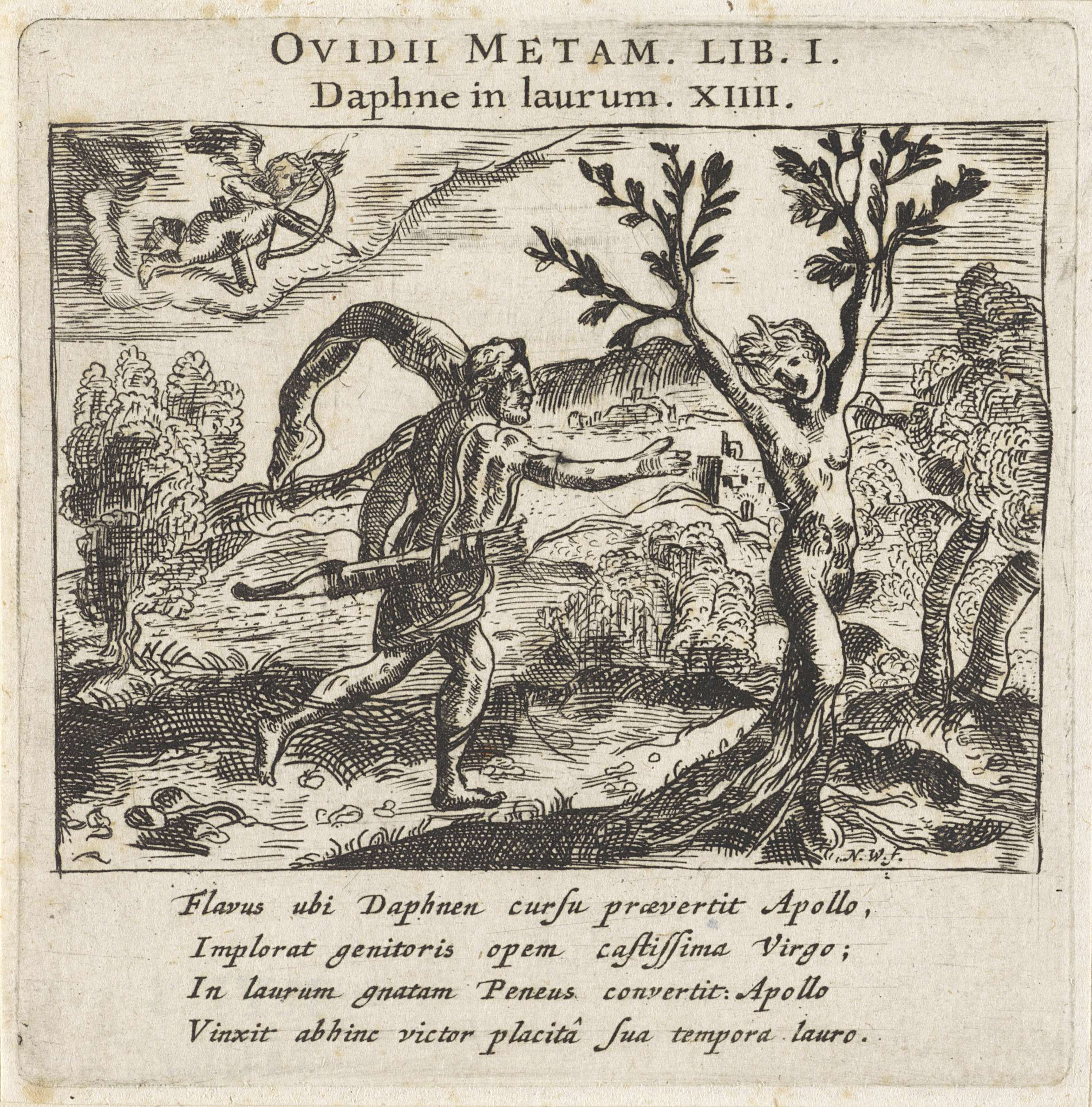 Daphne wordt door haar vader Peneus in een laurierboom veranderd. Apollo, die haar heeft achtervolgd, strekt tevergeefs zijn arm naar haar uit. Linksboven spant Cupido zijn boog. Onder de voorstelling een vierregelige toelichting in het Latijn.