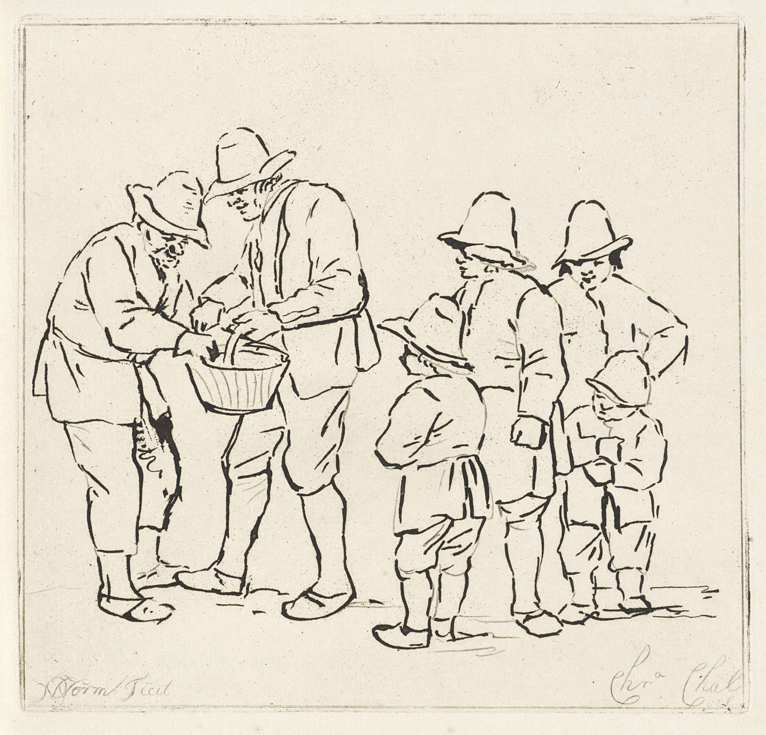 Twee mannen houden een mand vast en drie jongens kijken toe.