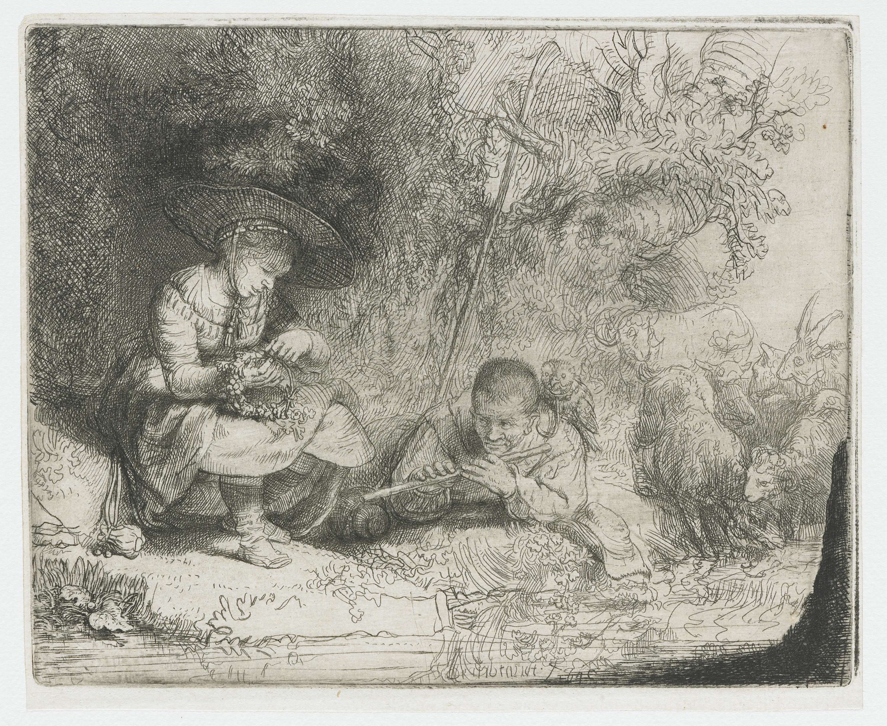 Niet voor niets heette deze prent vroeger het Uylenspiegeltje (de deugniet). Rembrandt verborg allerlei erotische dubbelzinnigheden in deze scène van een herderspaar langs de waterkant. De man kijkt stiekem onder de rok van de vrouw en wijst met zijn fluit – een fallussymbool – toevallig dezelfde kant op. De vrouw vlecht een bloemenkrans, een toespeling ...