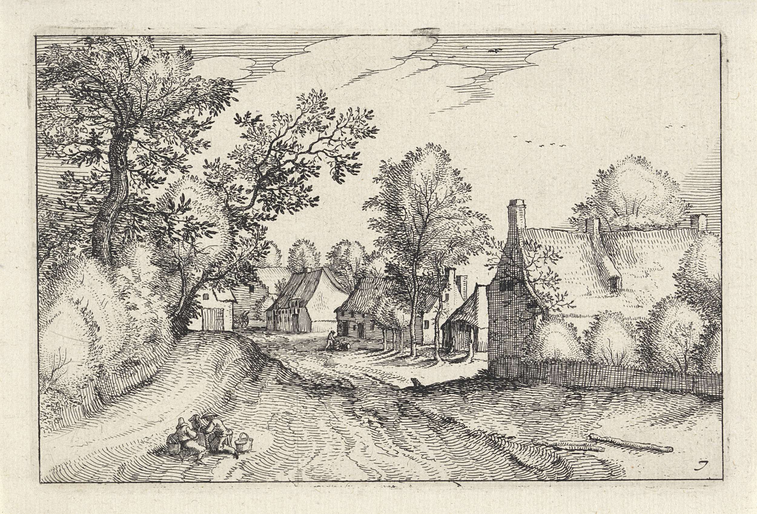 Gezicht op een rij huizen aan een onverharde weg. Op de voorgrond gebruiken drie figuren met manden de maaltijd.
