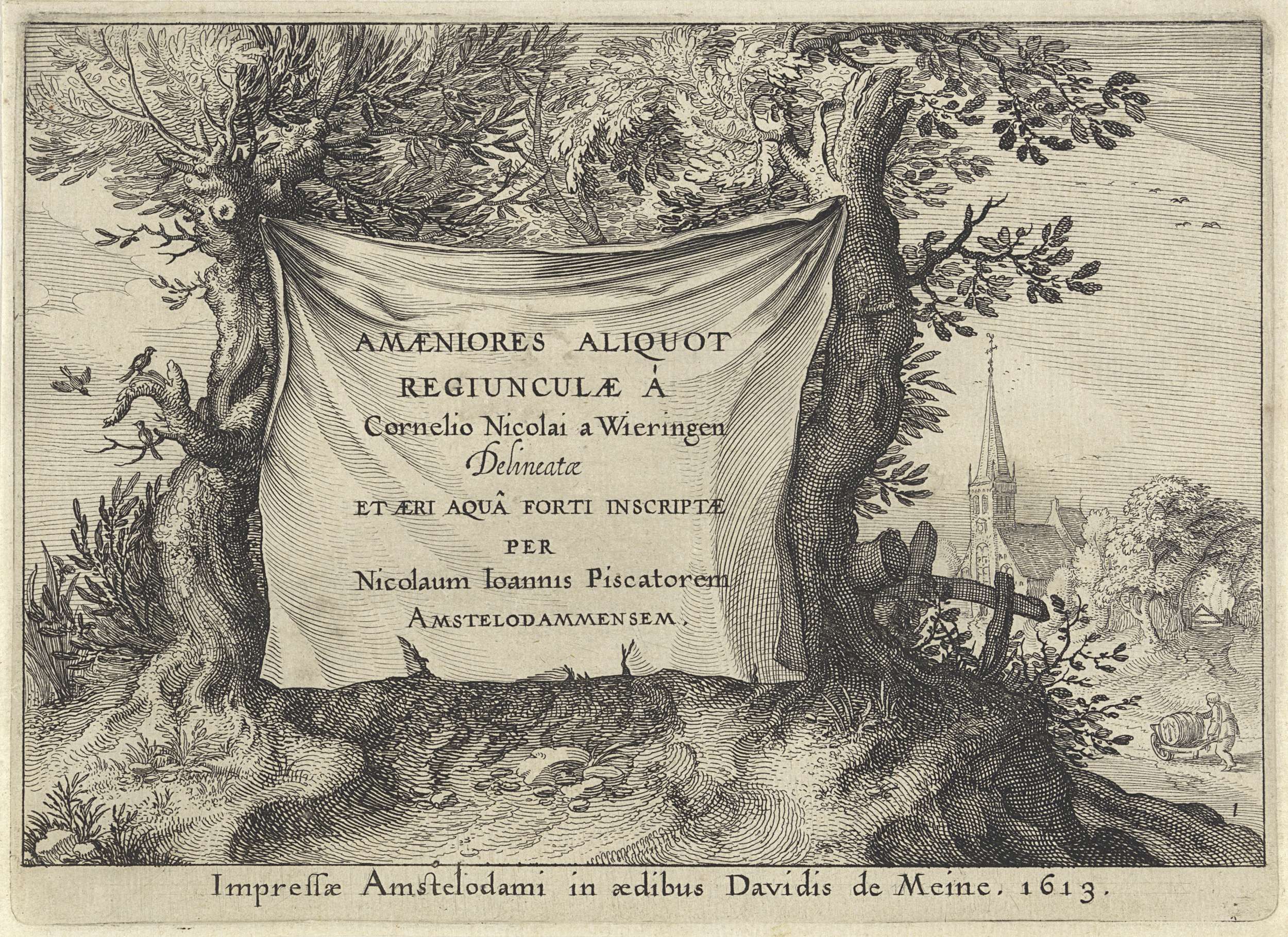 Tussen twee bomen is een witte lap opgespannen, waarop de titel van de serie: Amaeniores Aliquot Regiunculae. Rechtsachter op een landweg een man die een ton op een kar vervoert. Op de achtergrond een kerk.