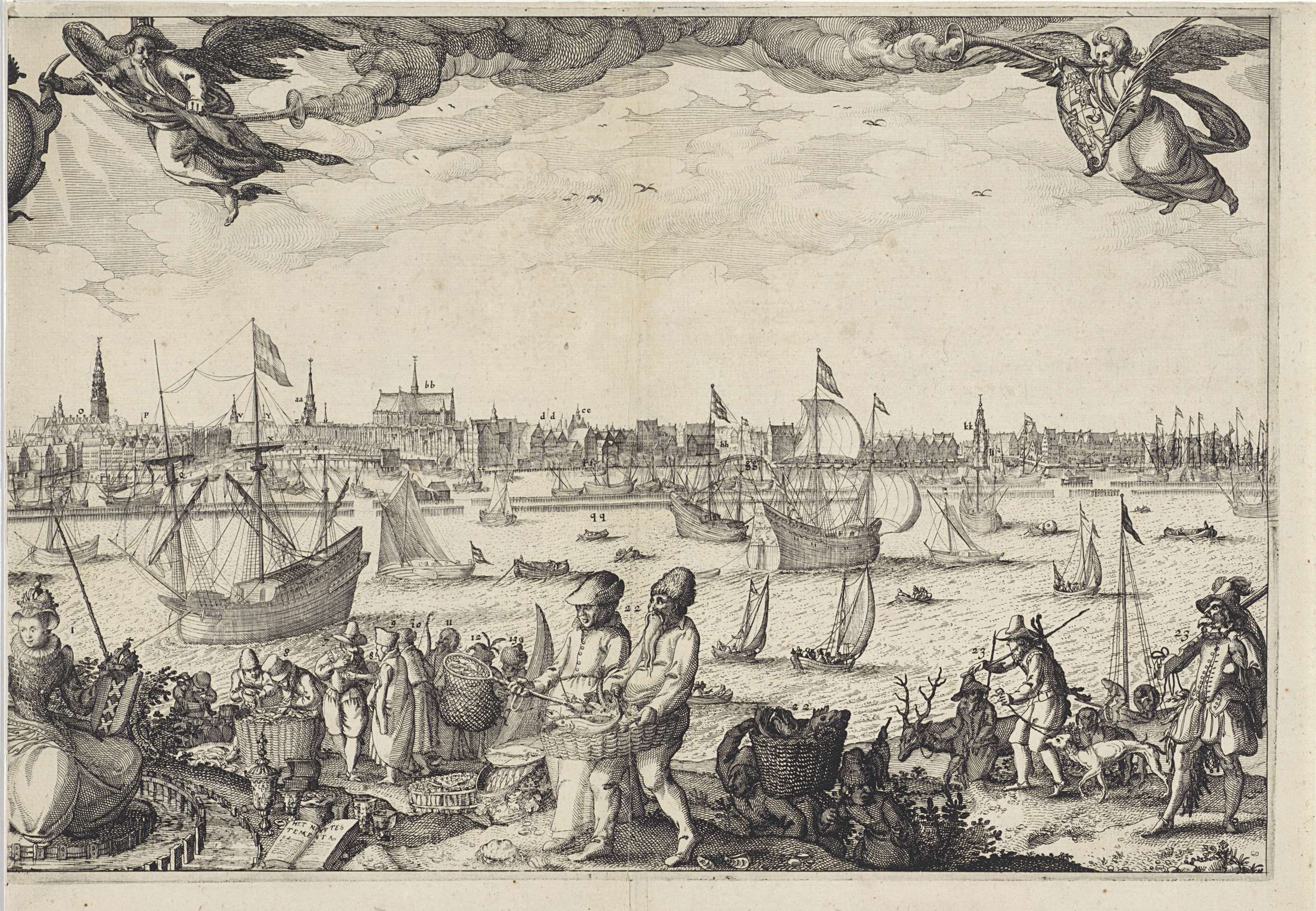 Profiel van een gedeelte van Amsterdam, gezien vanaf het IJ. Op de voorgrond links de Amsterdamse Stedenmaagd en rechts figuren uit alle delen van de wereld met hun koopwaar. Op het IJ varen schepen. In de lucht twee gevleugelde figuren die de trompet van de roem blazen.