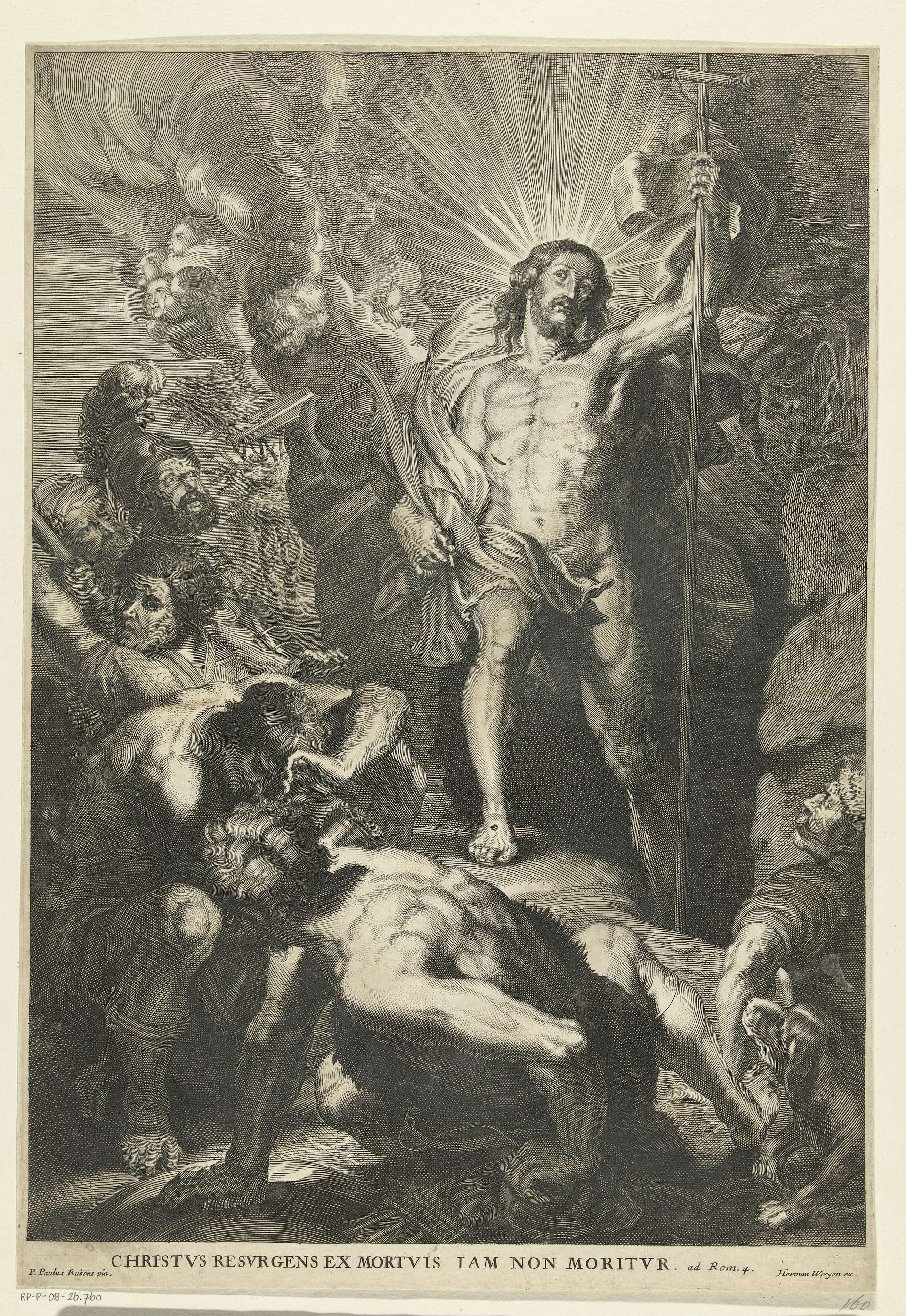 Christus staat op uit zijn graf en de bewakers reageren geschrokken op zijn verschijning. Onder de voorstelling staat een citaat uit Romeinen 4.