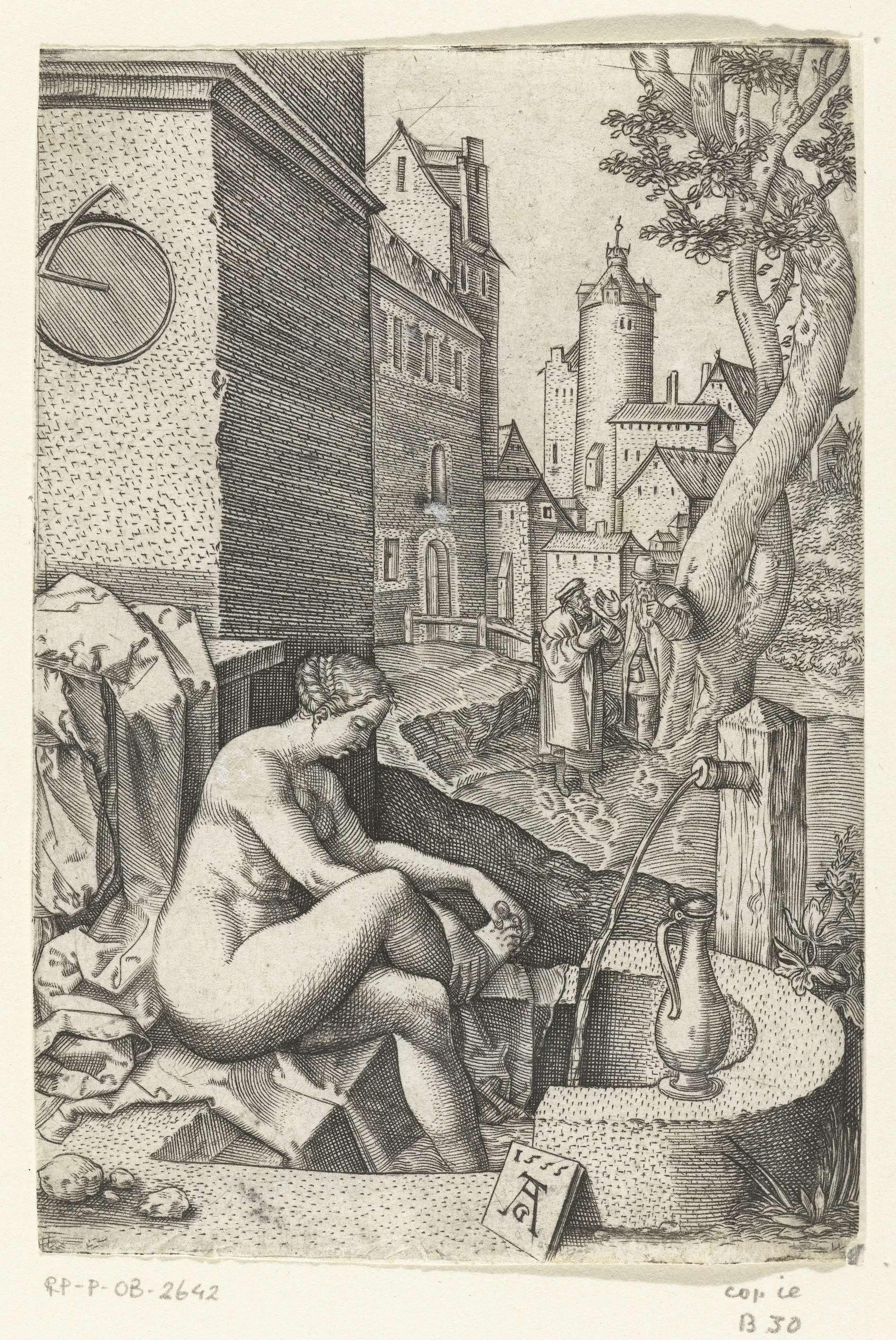 Susanna, naakt en badend bij een fontein in een tuin, de twee ouderlingen bij een boom. Aan de muur een zonnewijzer. Eerste prent uit een serie van vier kopieën met het verhaal van Susanna.