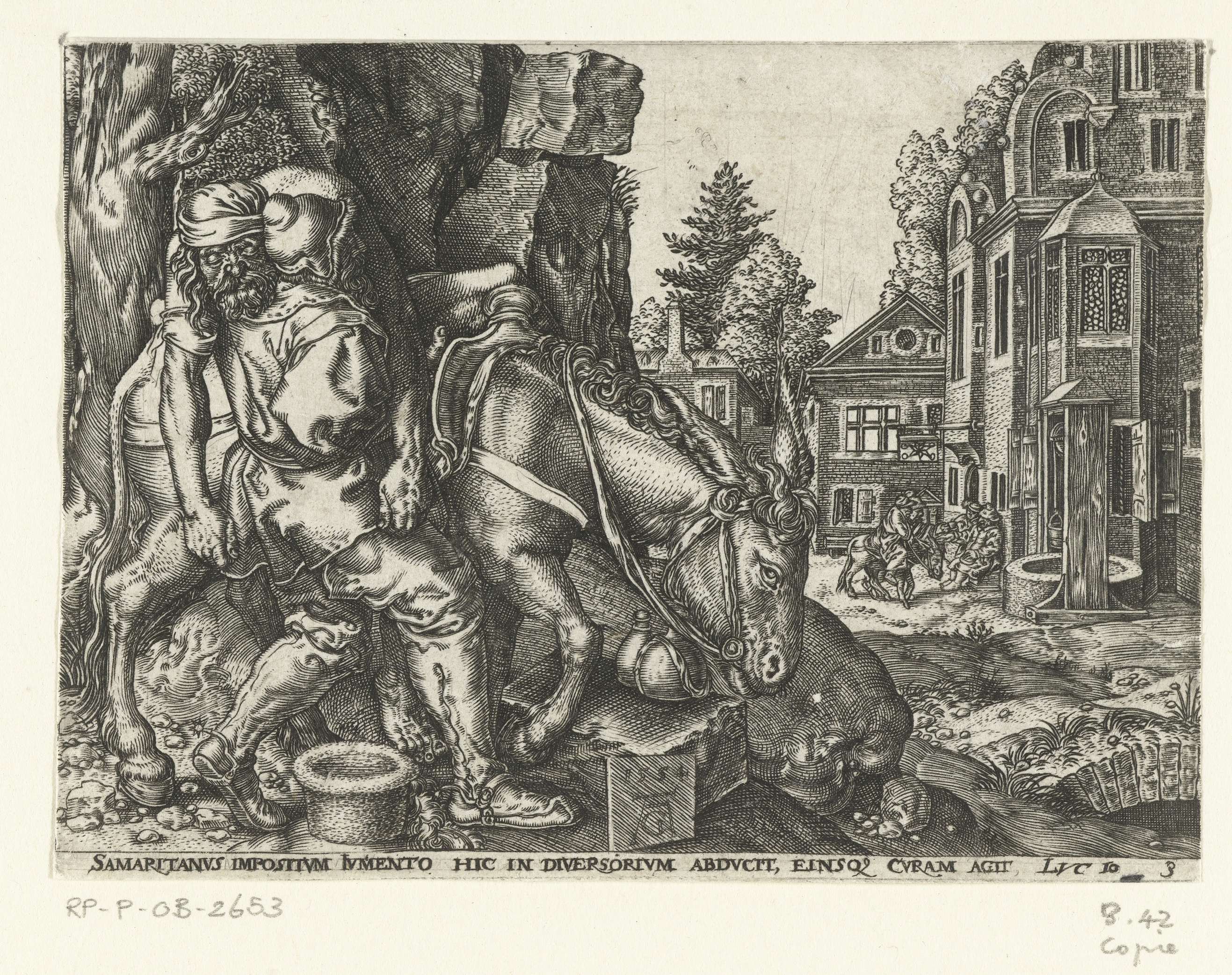De barmhartige Samaritaan tilt de gewonde man op zijn ezel, rechts op de achtergrond de aankomst bij een herberg. Onder de voorstelling de tekst: Samaritanus impostium iumento hic in diversorium abducit einsq curam agit Luc 10. Derde uit een serie van vier kopieën.