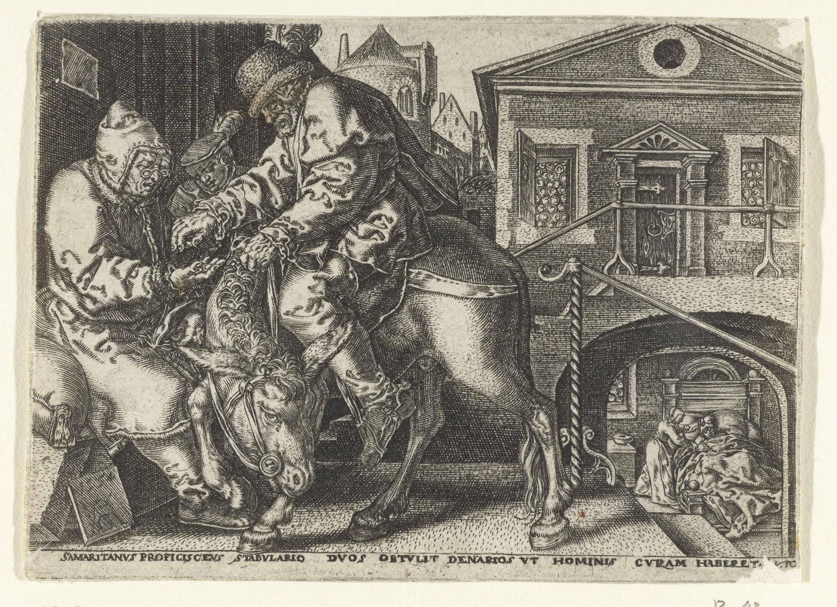 De barmhartige Samaritaan zittend op zijn ezel, betaalt de herbergier twee denarie. In de herberg ligt de beroofde man in een bed en wordt verzorgd door een vrouw. Onder de voorstelling de tekst: Samaritanus proficisceus stabulario duos obtulit denarios ut hominis curam haberet Lu 10. Vierde uit een serie van vier kopieën.
