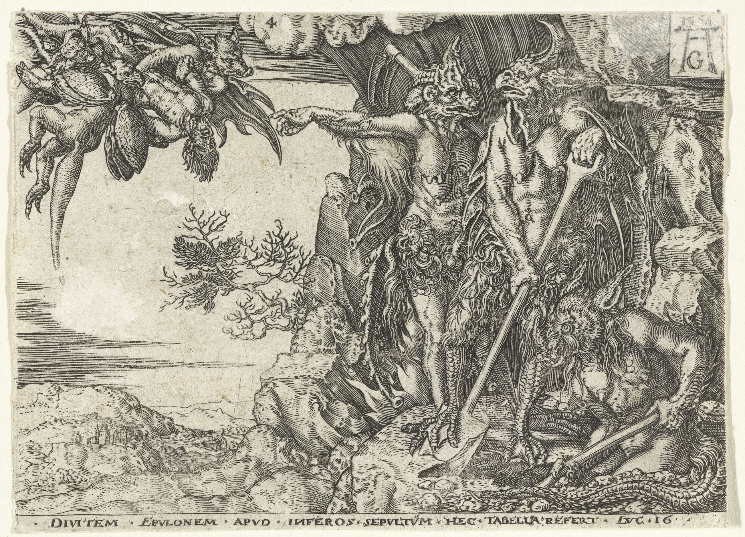 Drie duivels staan bij de ingang van de hel in een rots, drie andere komen aanvliegen met de rijke man. Onder de voorstelling de tekst: Divitem epulonem apud inferos sepultum hec tabella refert Luc 16. Vierde prent uit een serie van vijf kopieën.