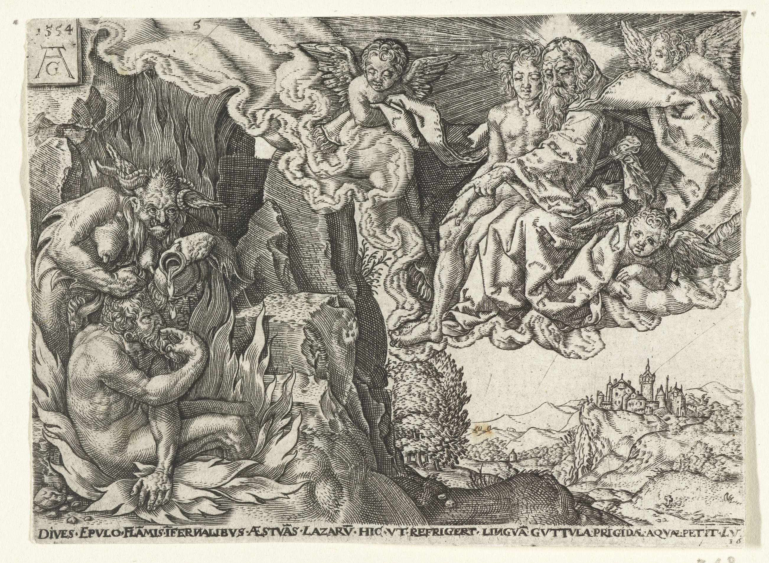 De rijke man, zittend in de vlammen van de hel, wijst naar zijn mond en vraagt om water, een duivel trekt aan zijn haar en druppelt water uit een kan. Aan de hemel in een wolk Abraham met Lazarus en drie engelen. Onder de voorstelling de tekst: Dives epulo fla mis ifernalibus aestuas lazaru(s) hic ...