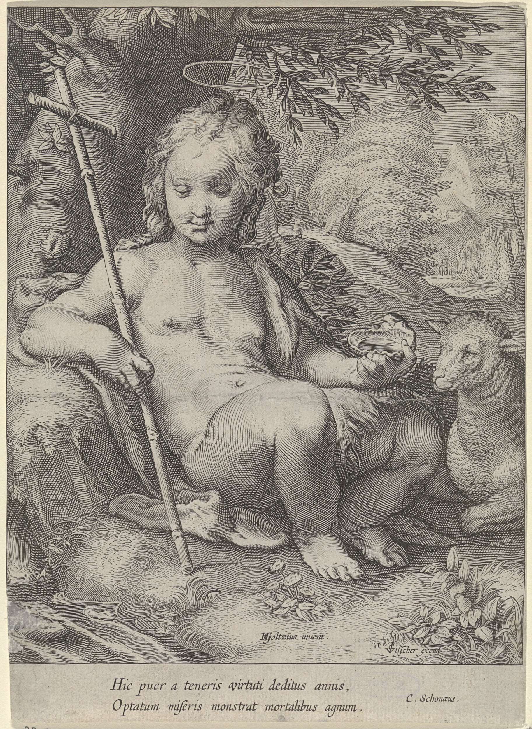 Johannes de Doper als kind, rustend in een landschap naast een stroompje, met in zijn hand een kruis en naast hem een lam. In zijn linkerhand heeft hij een schelp.