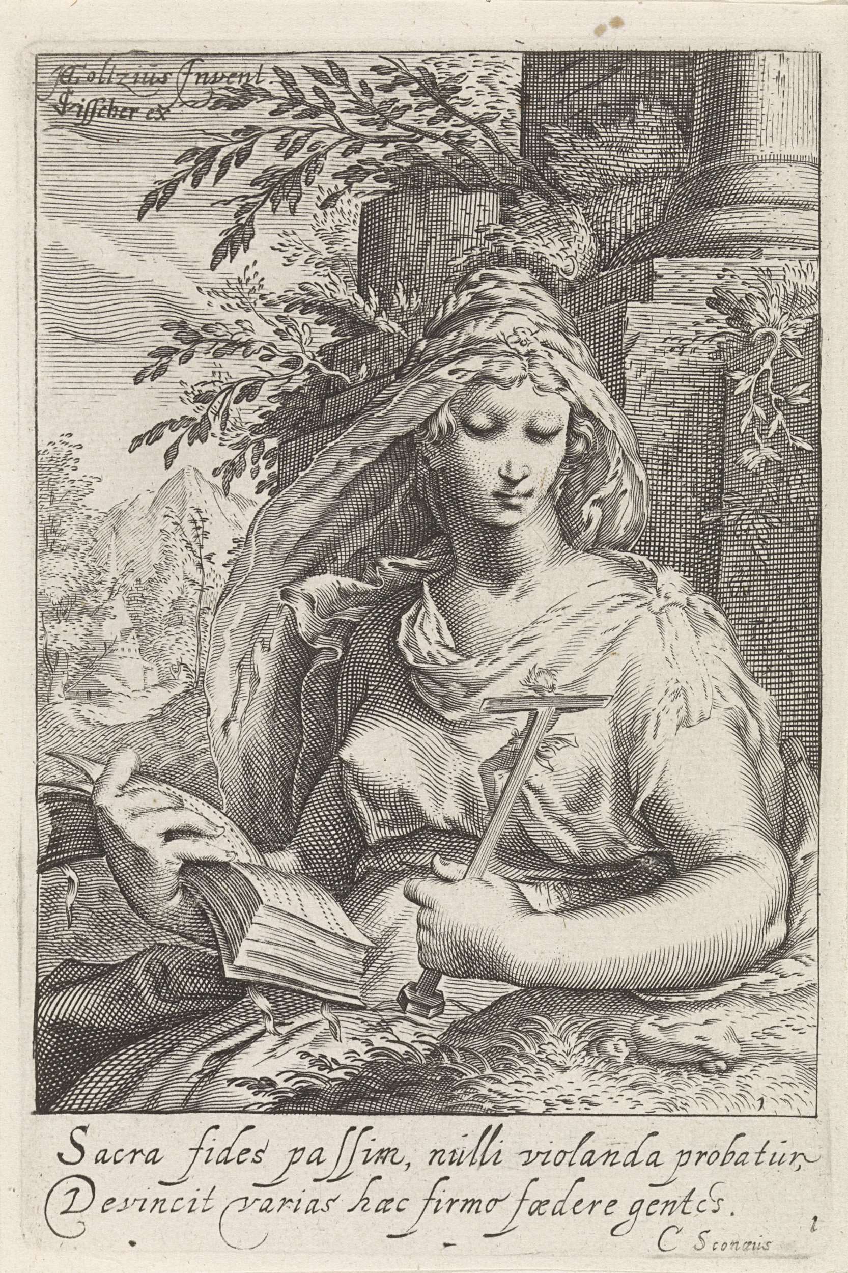 Een vrouwenfiguur met een crucifix en een bijbel in een landschap als personificatie van het geloof (fides).