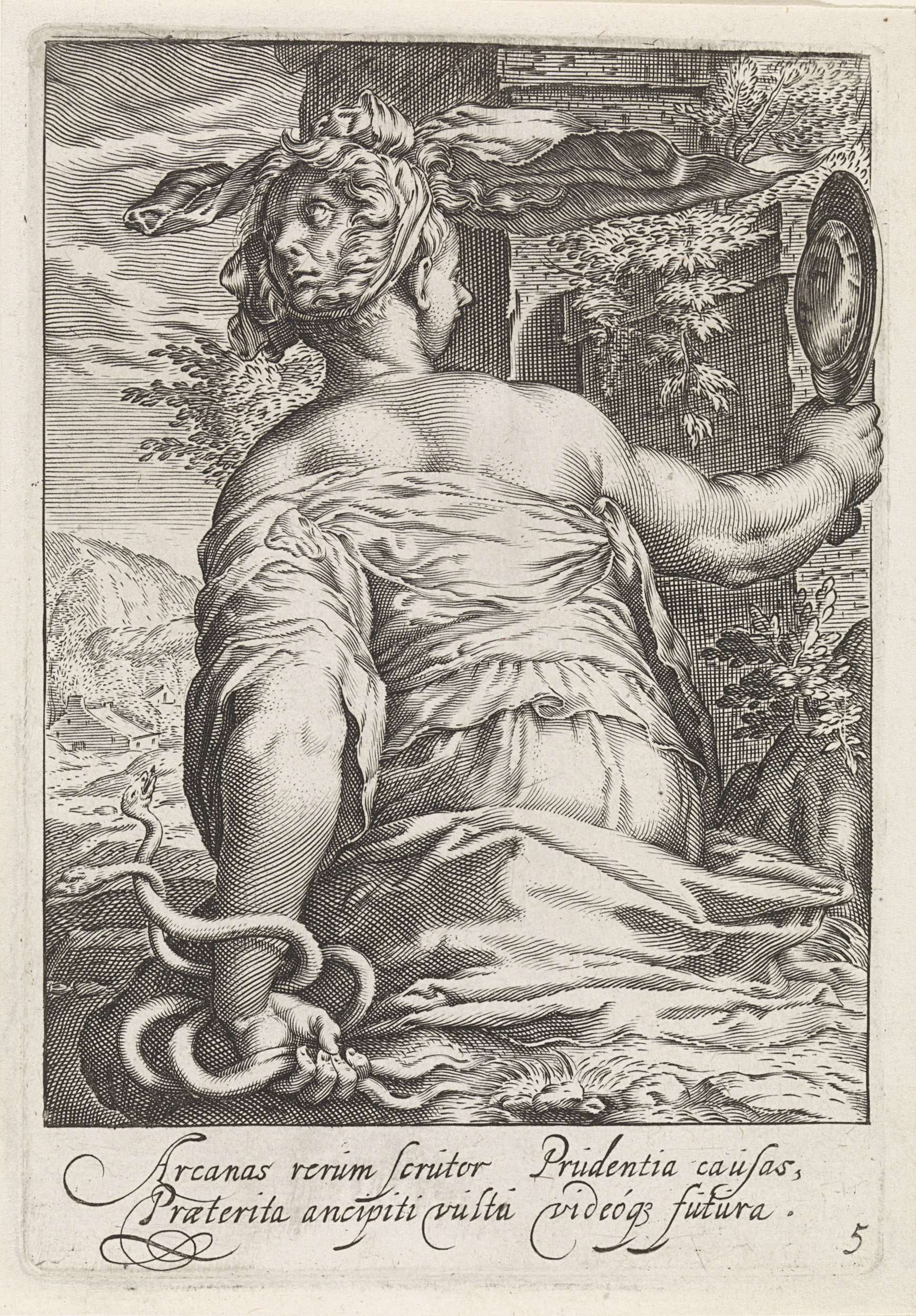 Een vrouwenfiguur met een tweede gezicht op haar achterhoofd als personificatie van voorzichtheid (prudentia). In haar ene hand heeft zij een spiegel en in haar andere hand twee slangen.