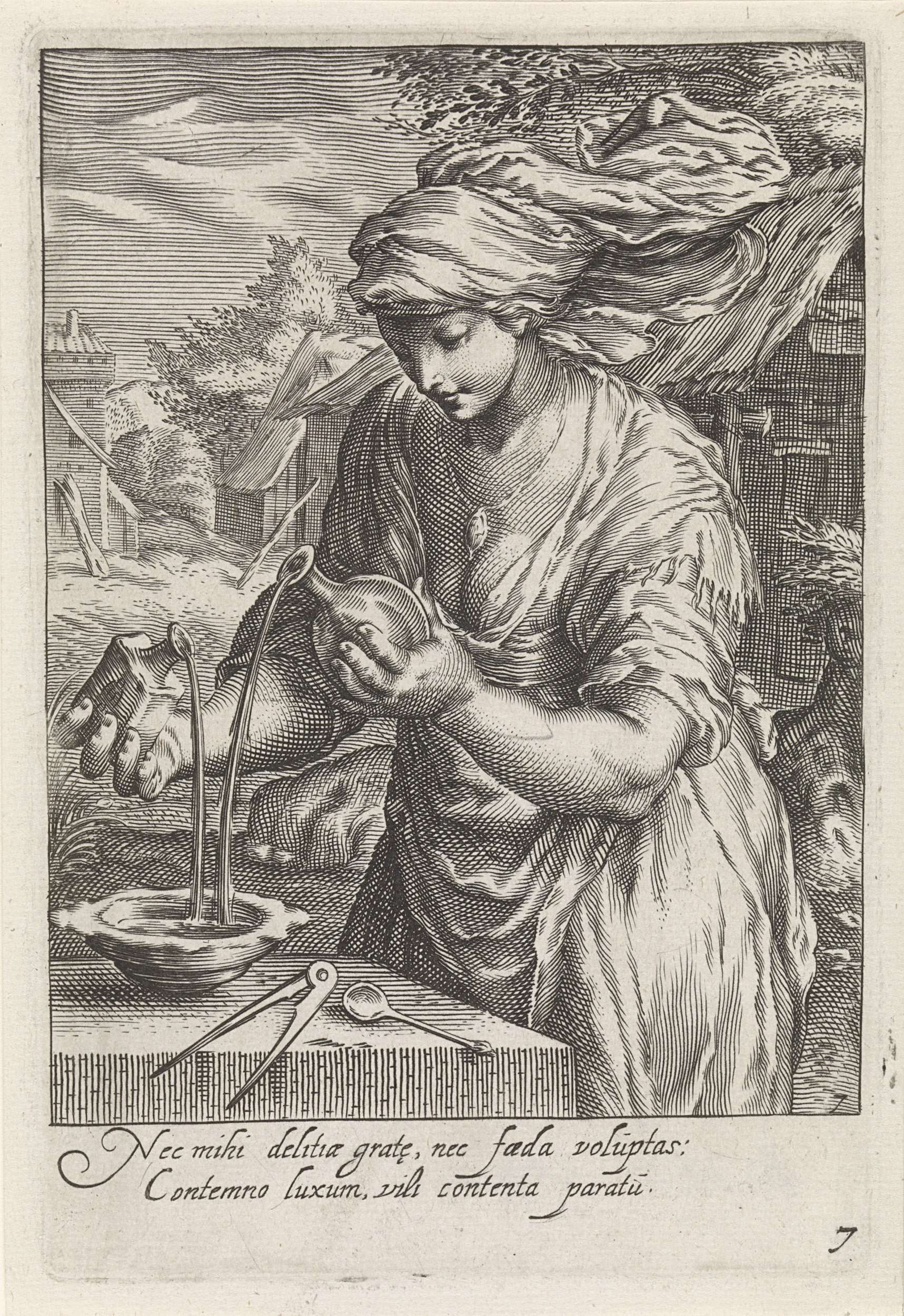 Een vrouwenfiguur die twee vloeistoffen uit twee verschillende flessen in een schaal mengt als de personificatie van matigheid (temperantia). Naast de kom liggen een schepje en een passer, zorgvuldige meetinstrumenten.