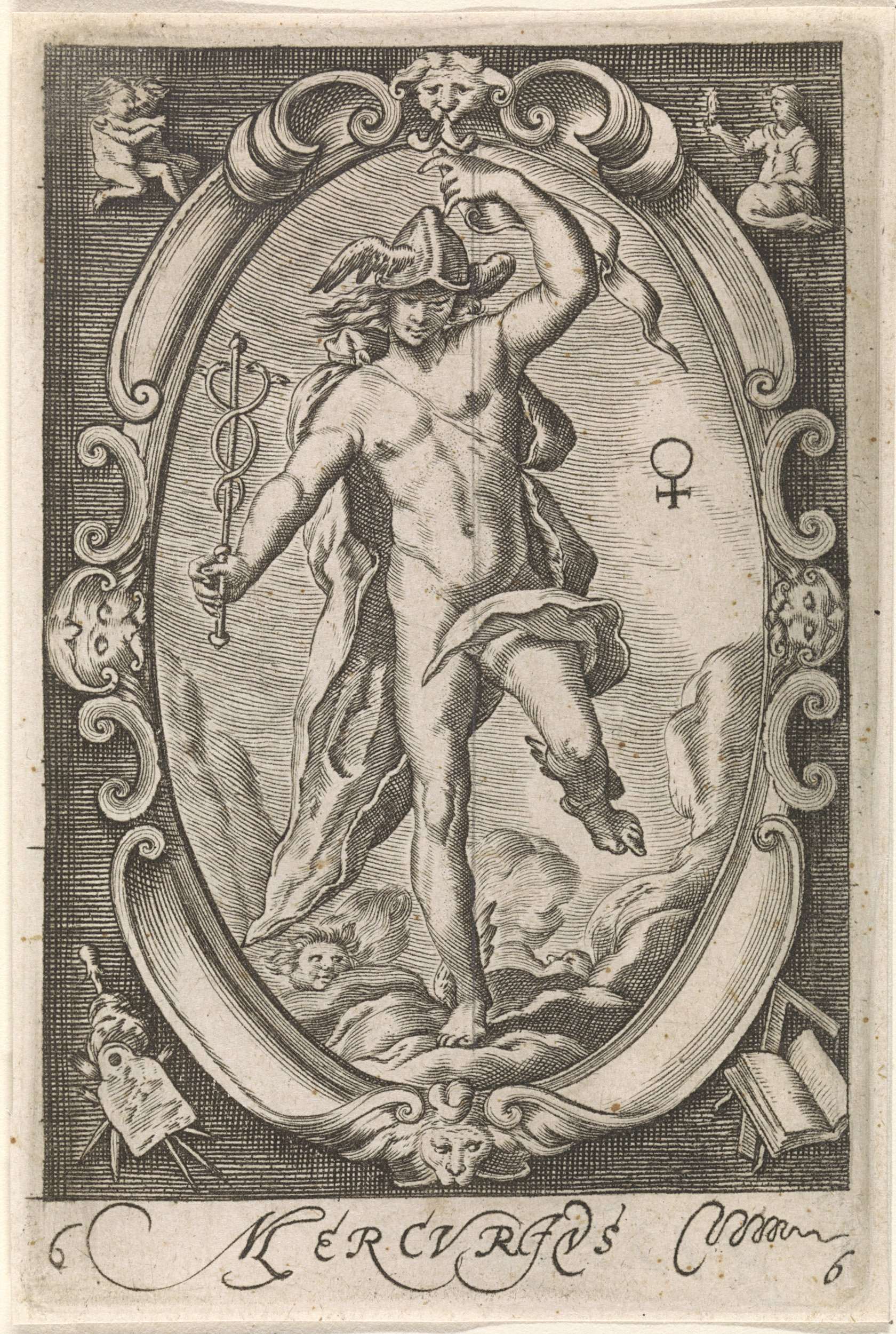 Mercurius, met in zijn hand een caduceus en op zijn hoofd een gevleugelde hoed (petasus). Rechts van hem het astronomische symbool voor zijn planeet. Staand in een ovaal cartouche met bovenaan de twee tekenen van de dierenriem: Tweelingen en Maagd.