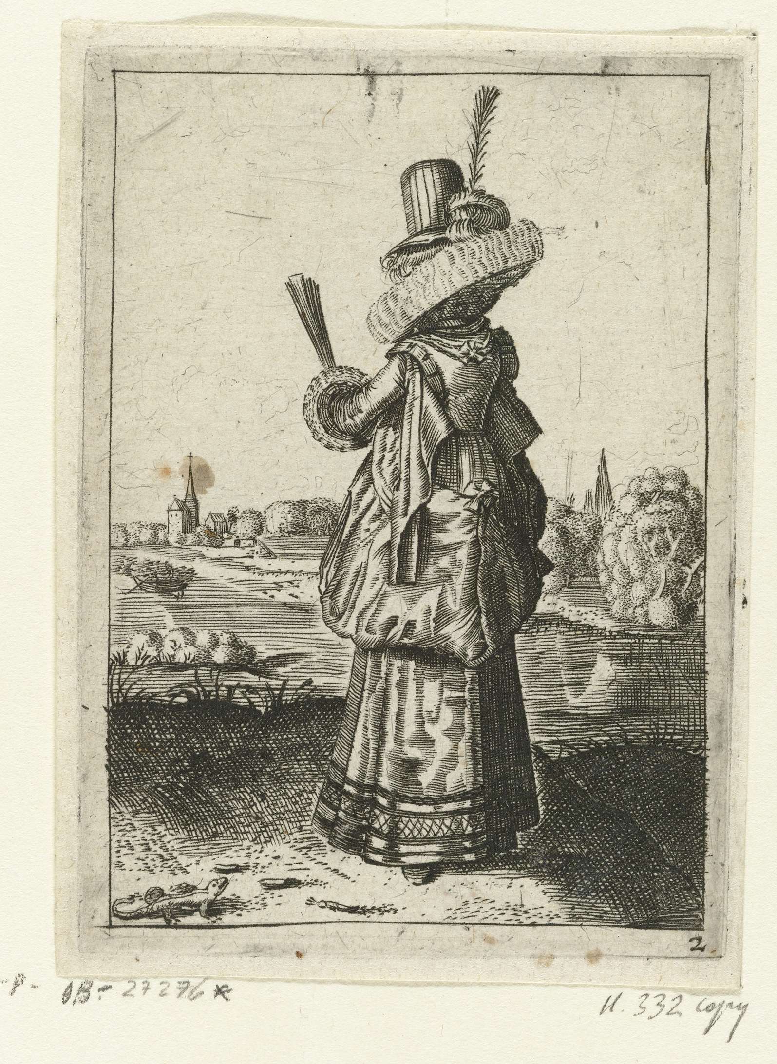 Dame, staand in landschap, schuin op de rug gezien, naar links, gekleed volgens de mode van ca. 1620. Ze draagt een japon met schouderkleppen en een grote lubbenkraag op een portefraes. De rok is opgeslagen. De mouwen zijn afgezet met opzij uitstaande manchetten. Op haar hoofd een hoed met hoge bol en veer; een dichte, ...