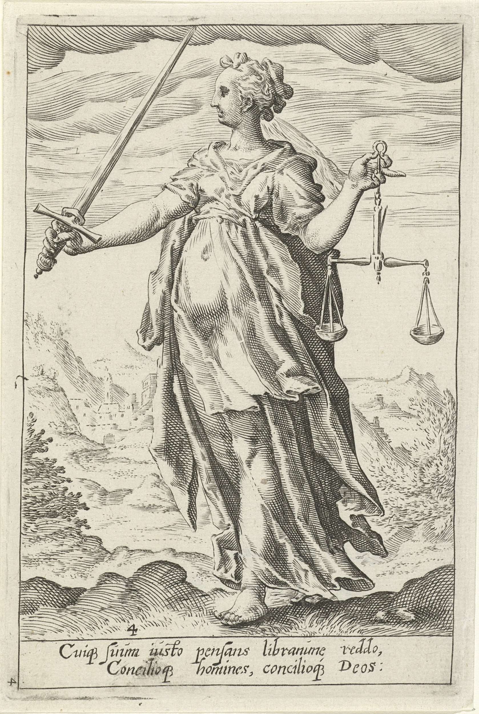De gepersonifieerde Rechtvaardigeid; een vrouwenfiguur met zwaard en weegschaal.