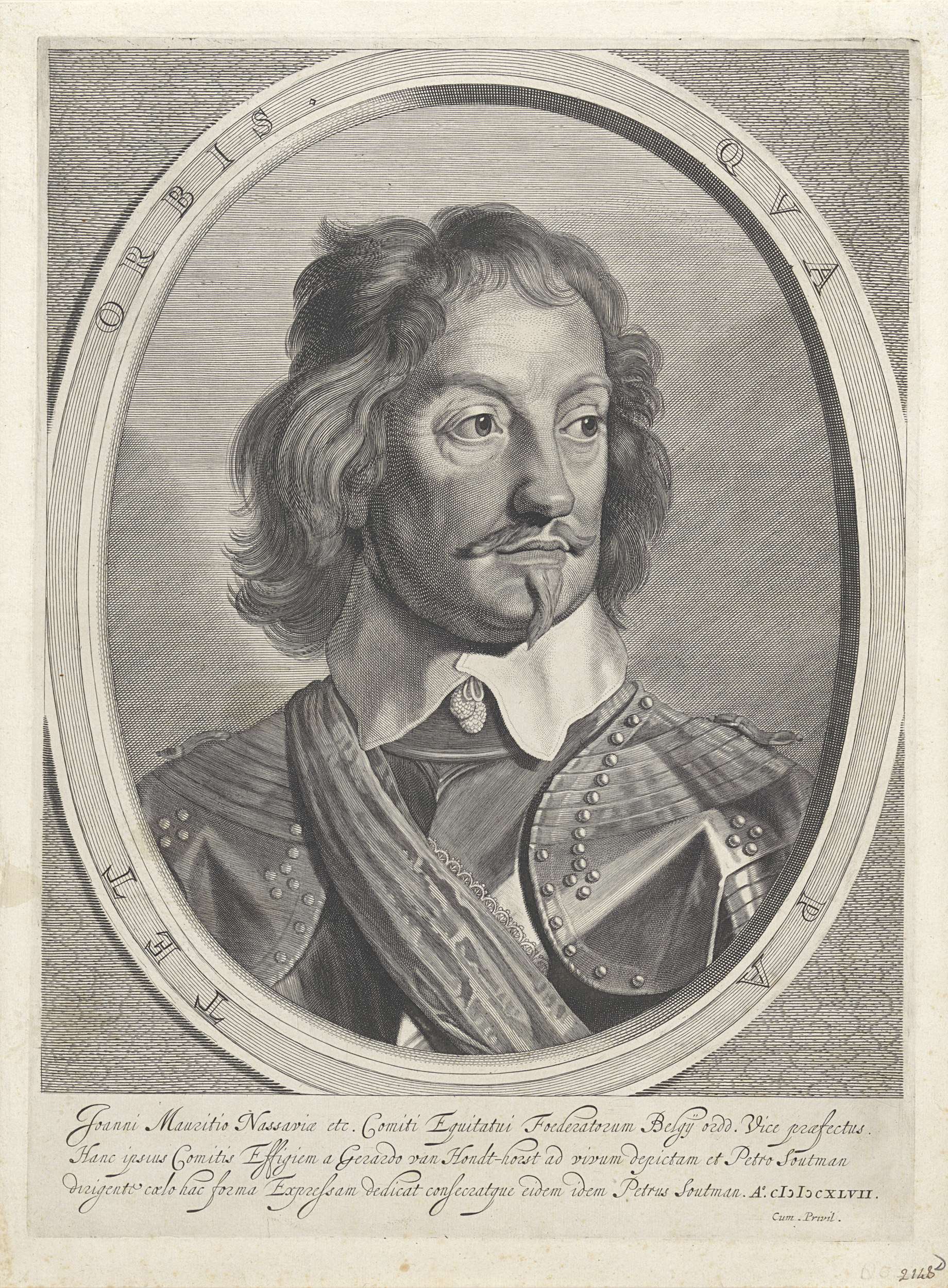 Johan Maurits, graaf van Nassau-Siegen, bijgenaamd 'de Braziliaan'. Hij draagt een wapenrusting. In de ovale omlijsting zijn motto. Prent uit een serie van 6 prenten met portretten van edelen.