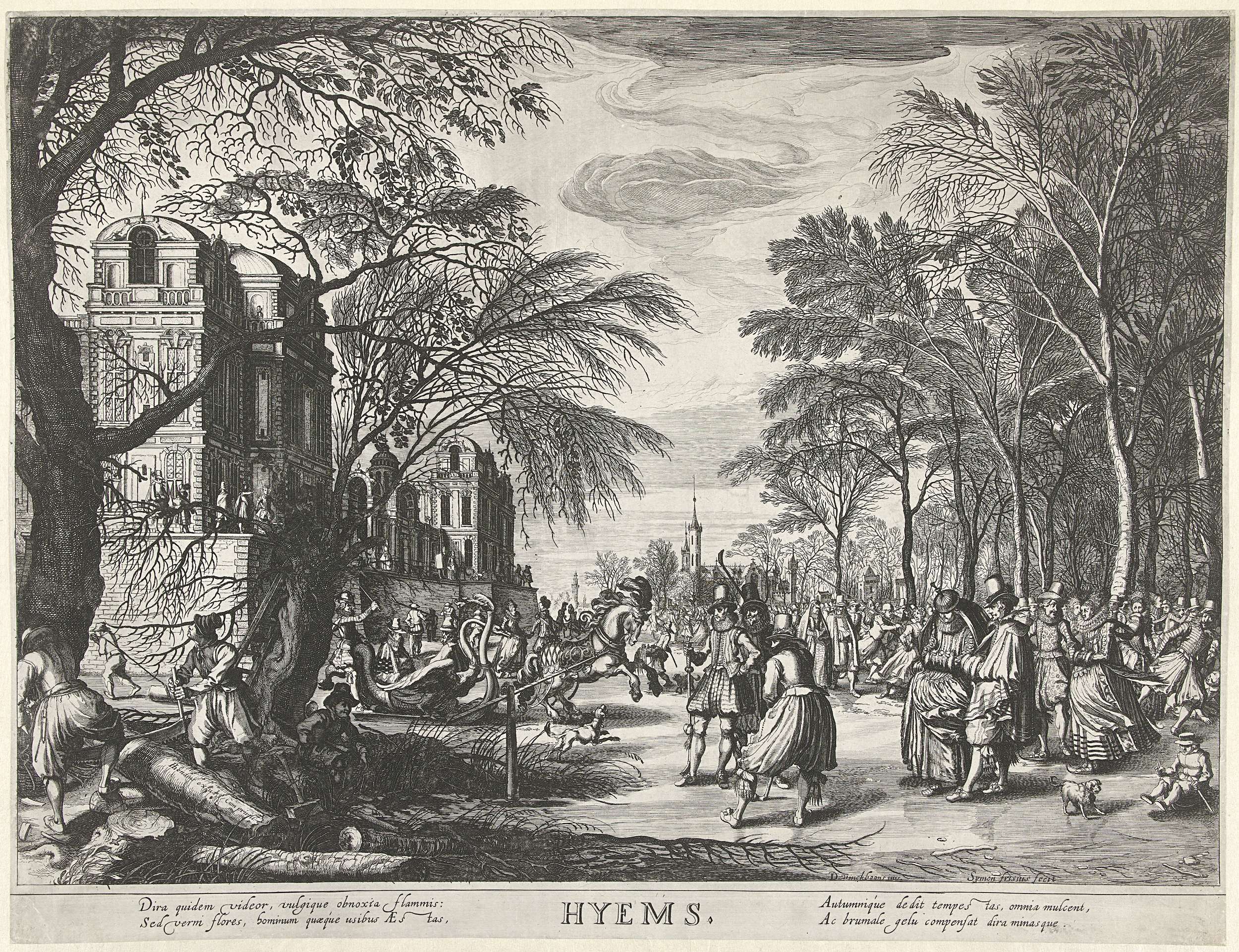 Elegant geklede figuren vermaken zich op diverse manieren op het ijs in een bosrijke omgeving. Links staat een gebouw.