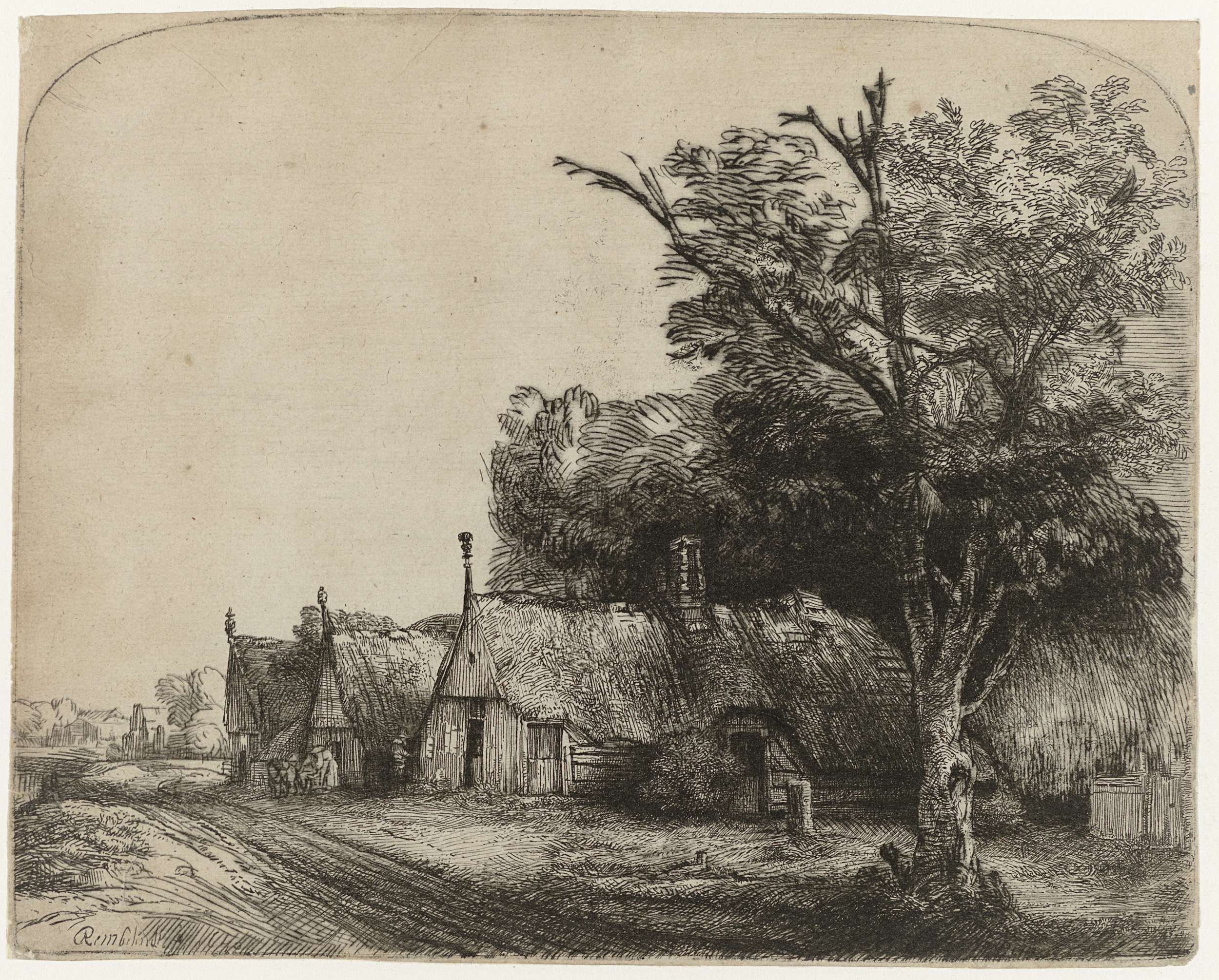 In de latere jaren van zijn loopbaan etste Rembrandt ook veel landschappen. Vaak is de locatie goed te herkennen. Deze boerderijen vond hij ten zuidwesten van Amsterdam langs de Schinkelweg. Over topografische nauwkeurigheid maakte hij zich overigens niet erg druk. De huizen voorbij de eerste boerderij zijn een tamelijk vrije vertaling van de situatie ter ...