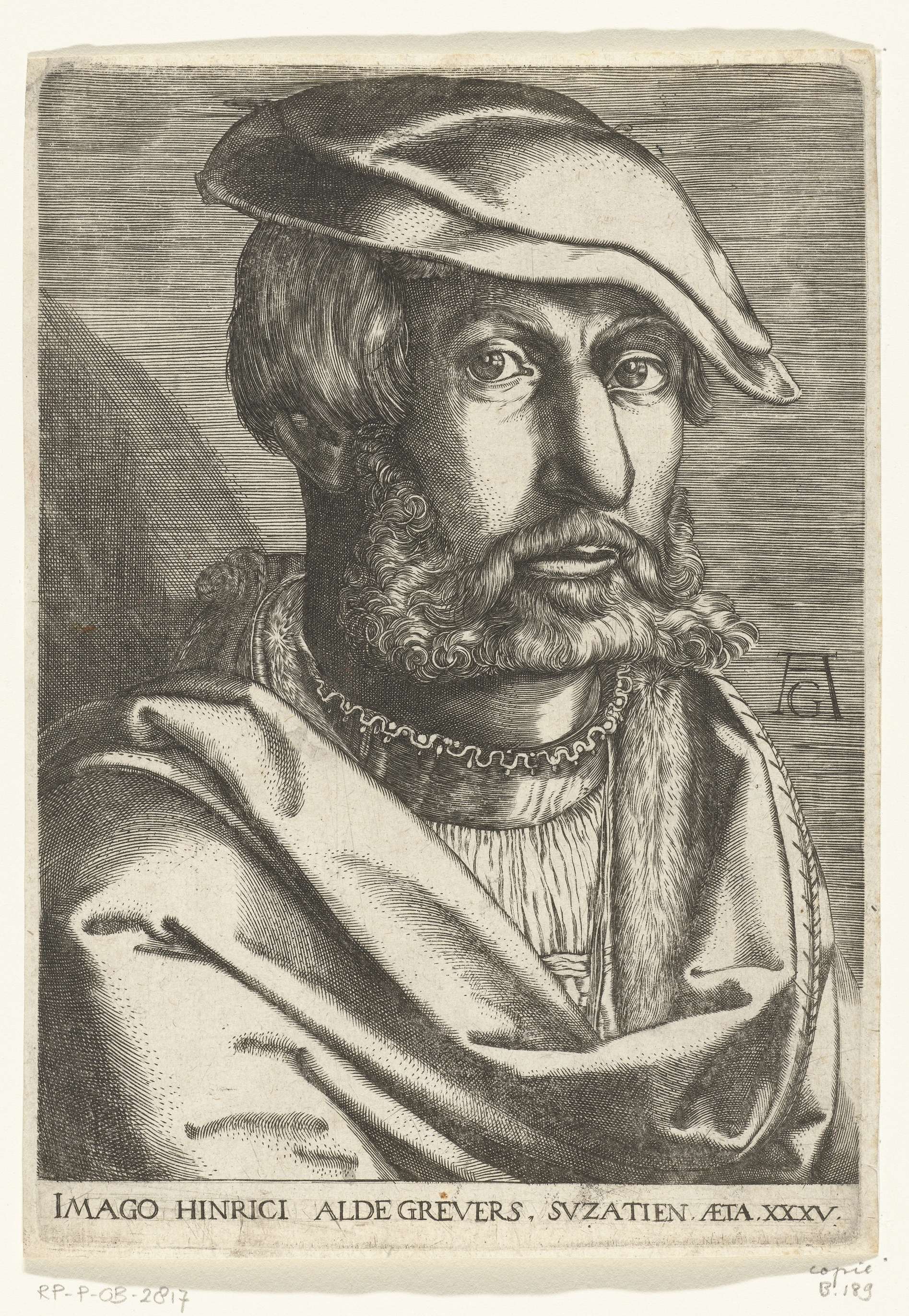 Portret van Heinrich Aldegrever op vijfendertigjarige leeftijd, met baard. Buste, driekwart naar rechts gekeerd. Onderaan een tekst in het Latijn.