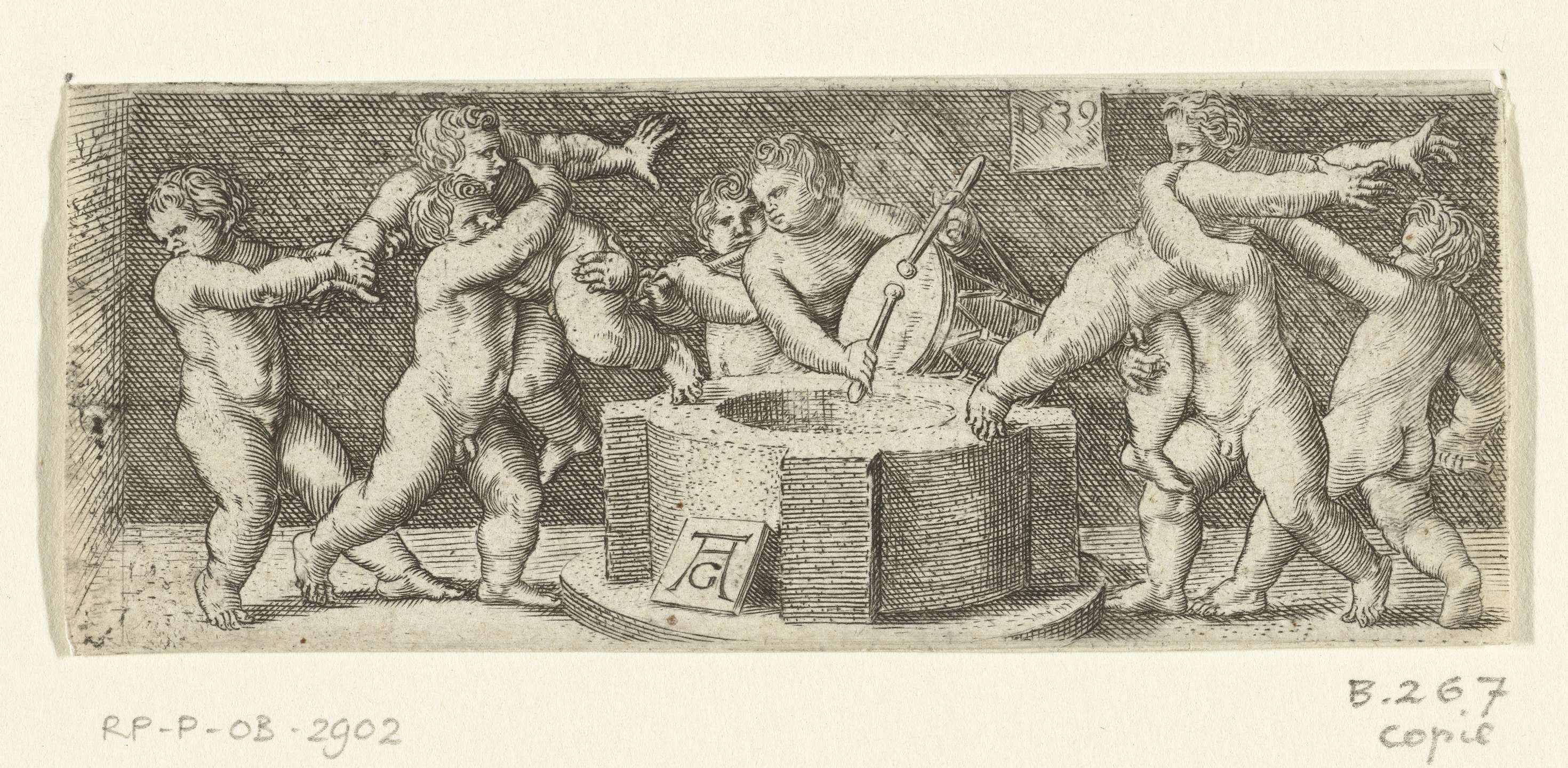 Fries met acht naakte kinderen bij een put. Zowel links als rechts proberen twee kinderen een derde in de put te gooien. Achter de put staan twee kinderen met een trommel en een fluit.