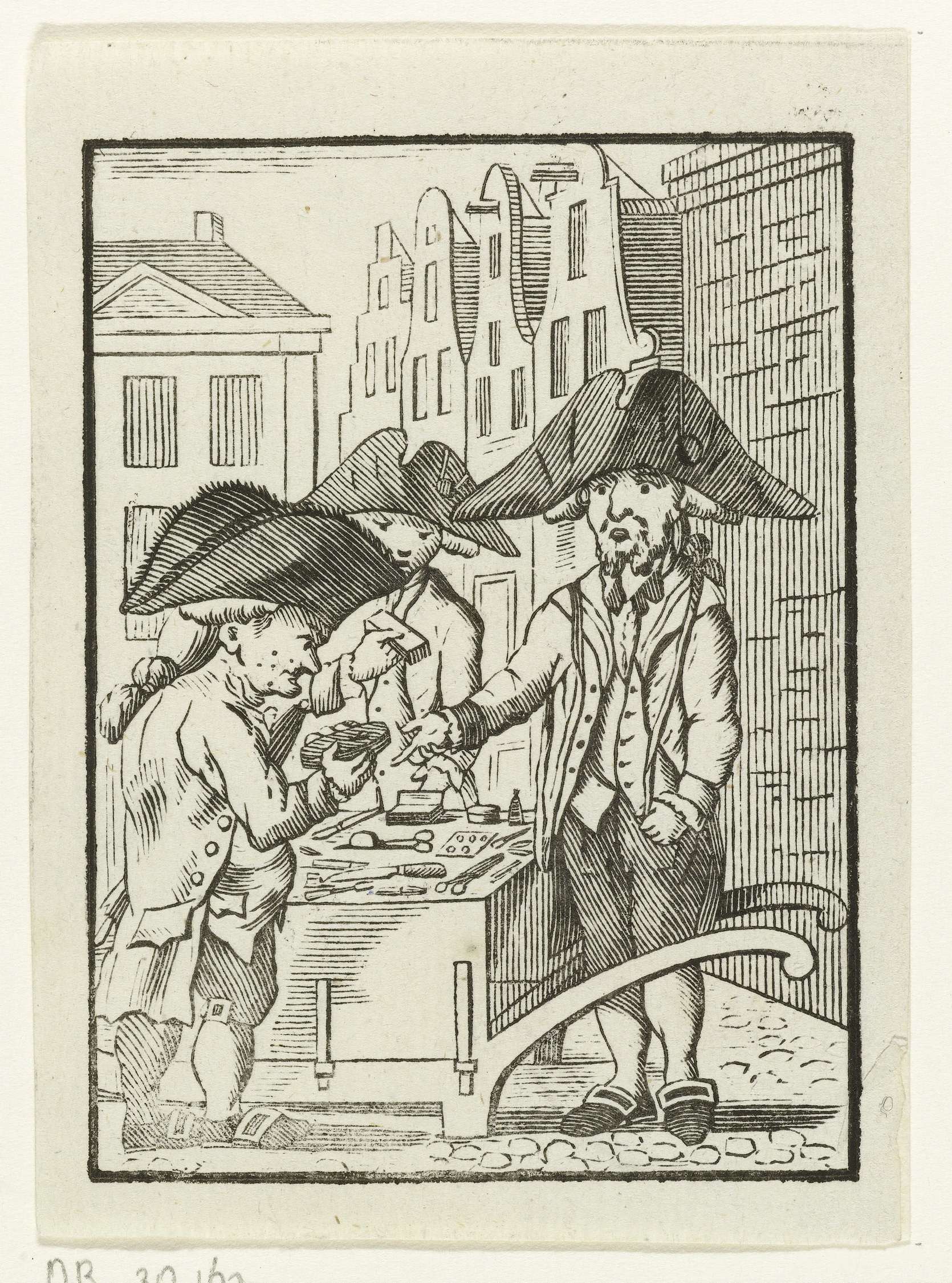 Straatverkoper Nathan van Neurenberg achter een handkar met twee klanten