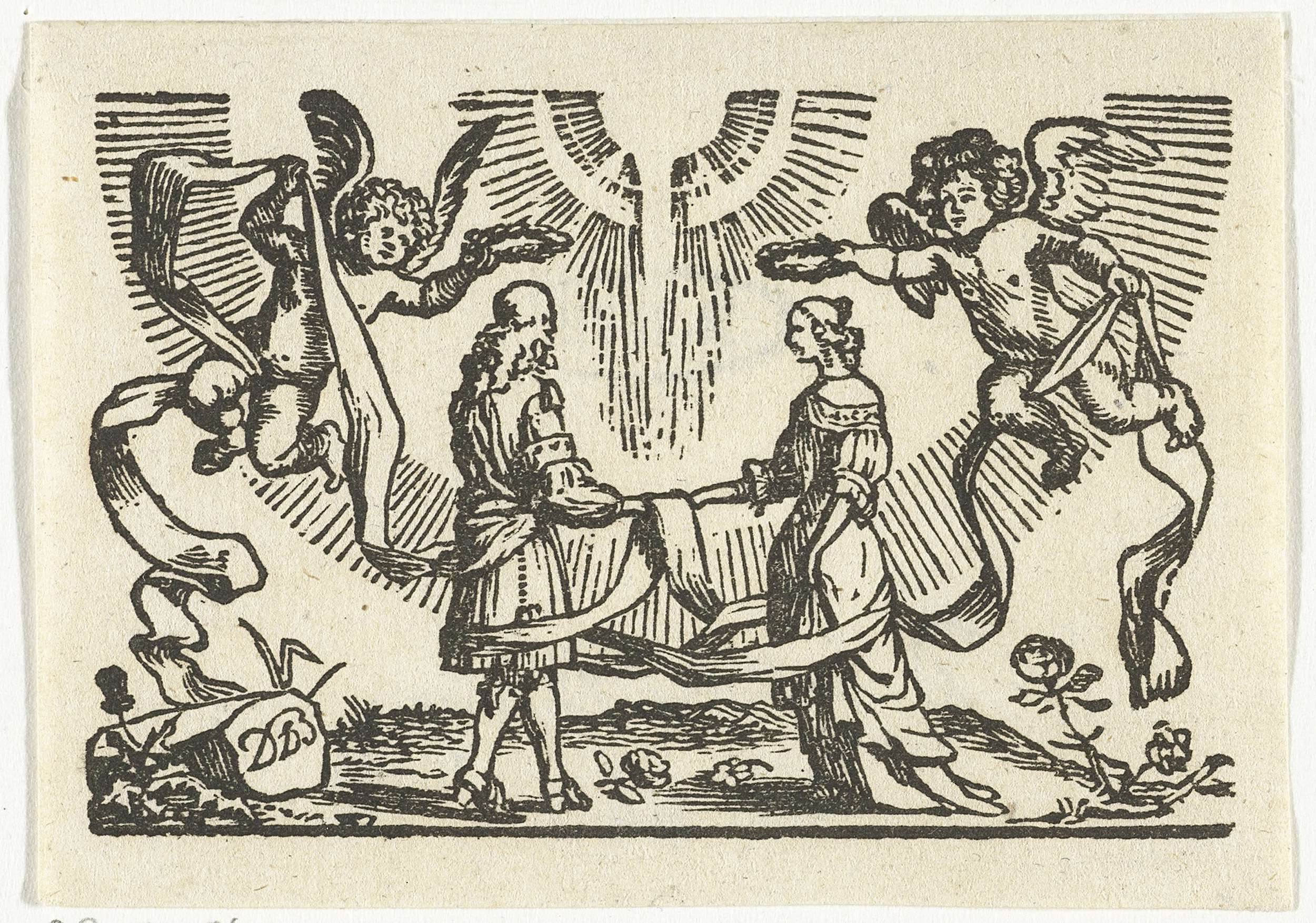 Een jonge vrouw en een man houden elkaars rechterhand vast. Zij worden gekroond door twee engelen en met elkaar verbonden door een lang lint.
