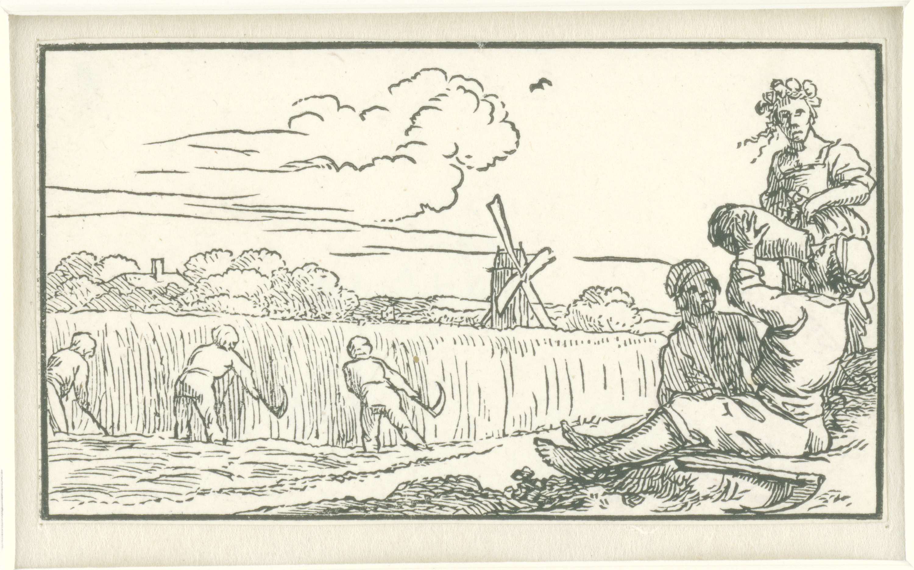 Een vrouw met een bloemenkrans staat naast twee rustende mannen. Op de achtergrond zijn drie figuren gewas aan het oogsten.