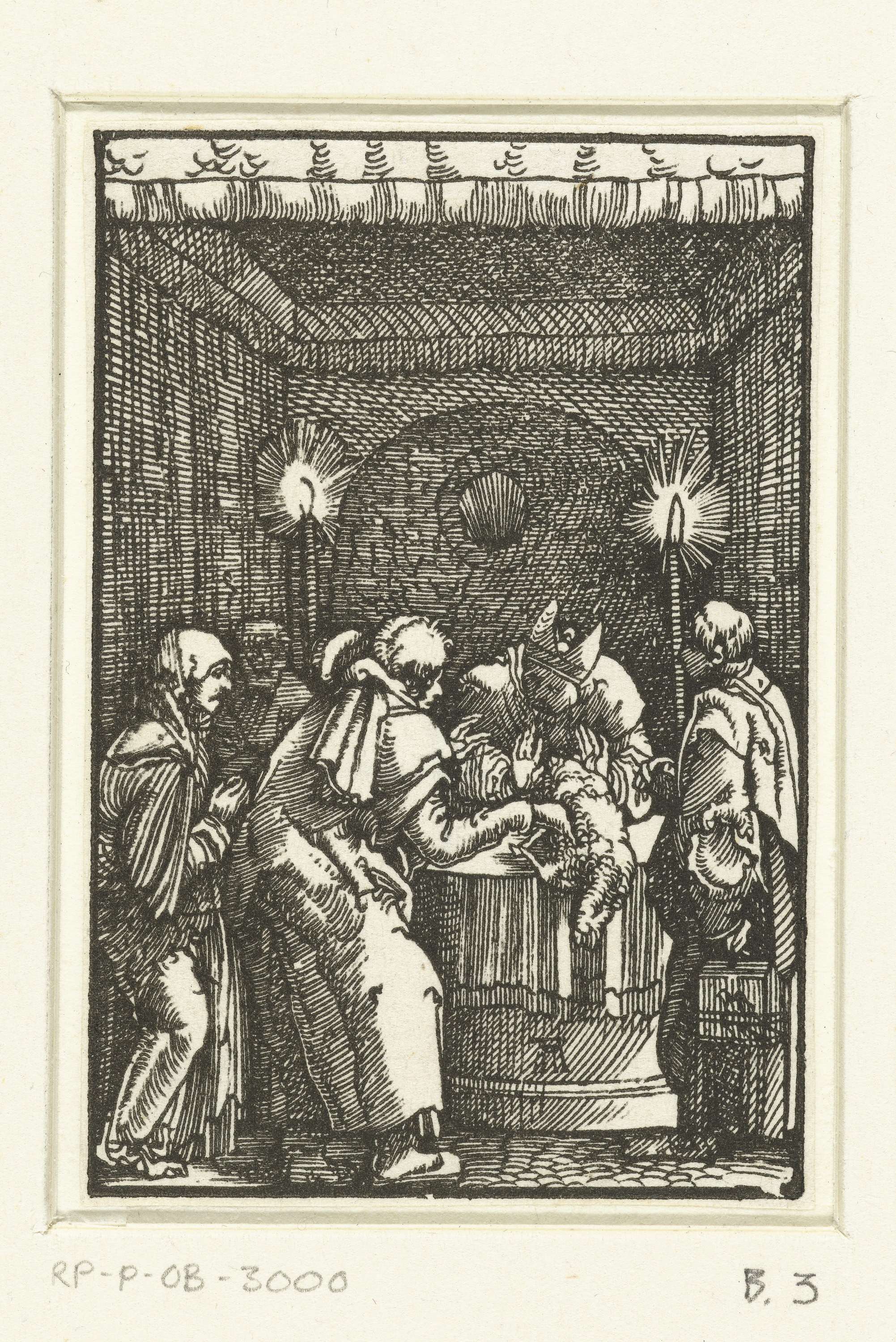 Joachim legt een lam op het altaar in de tempel, zijn vrouw Anna staat achter hem. De priester achter het altaar weigert het offer. Derde prent uit een serie van veertig.