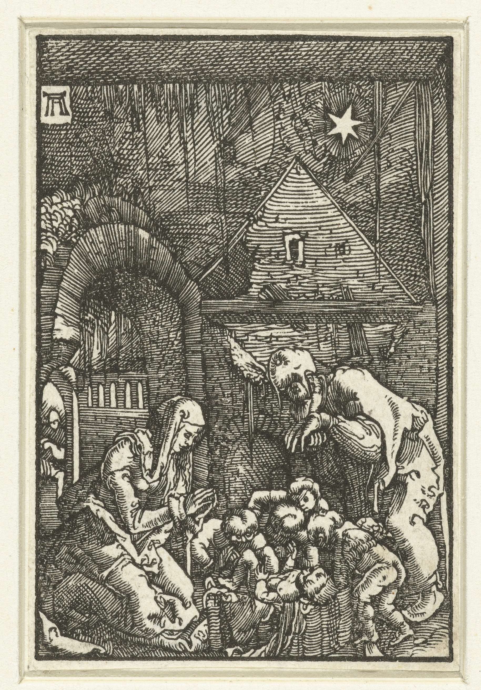 Het Christuskind liggend in een kribbe, Maria Jozef en vier engeltjes er omheen. Negende prent uit een serie van veertig.
