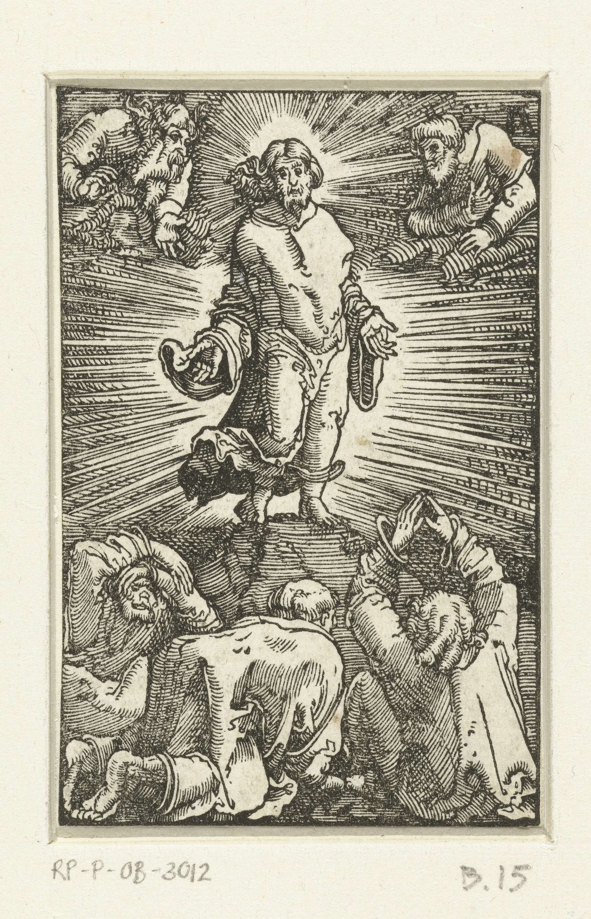 Christus staand op een rots, gehuld in een stralenkrans. In de wolken Mozes en Elia, onder aan de rots de drie discipelen Petrus, Jakobus en Johannes. Vijftiende prent uit een serie van veertig.