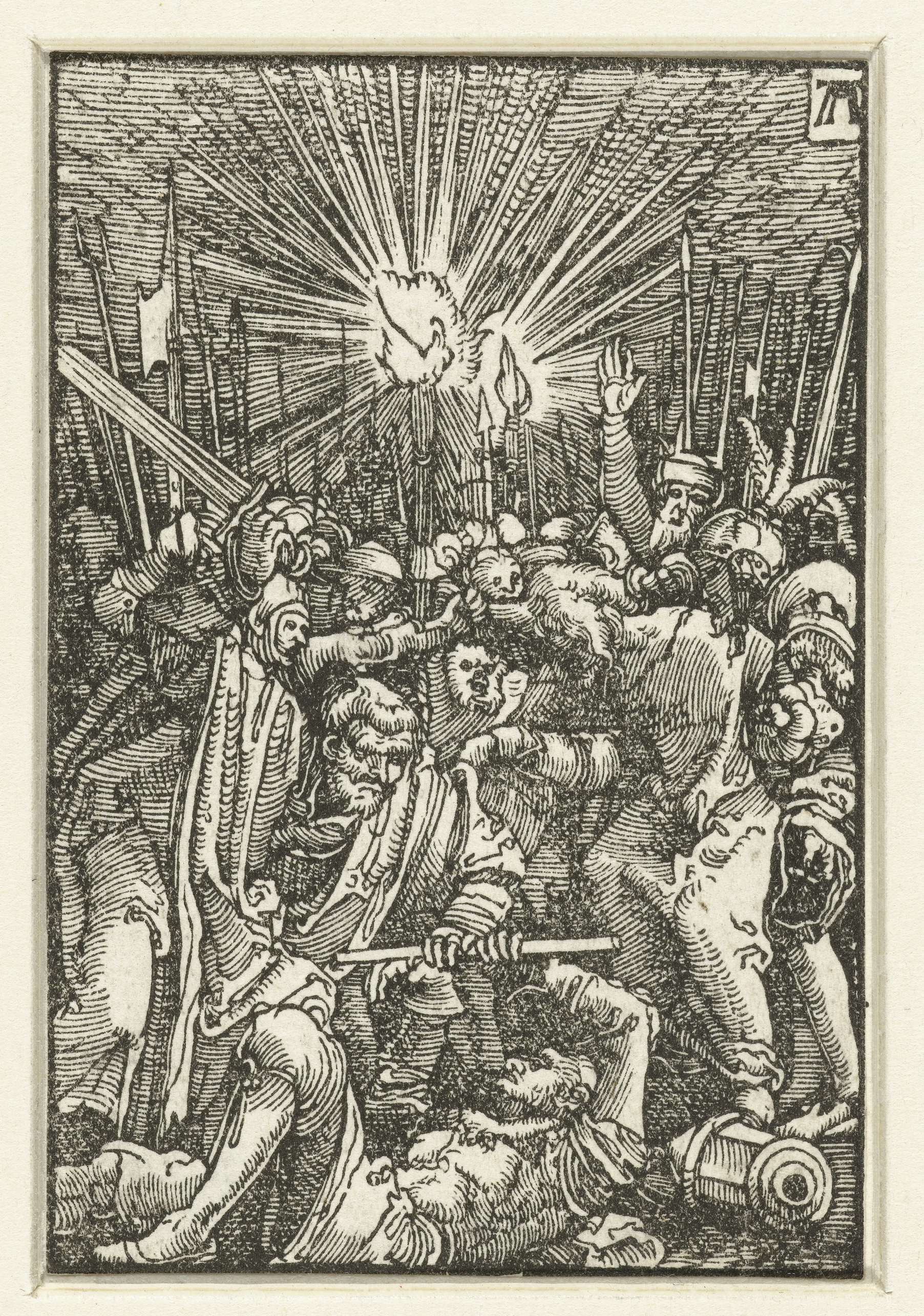 Christus wordt gevangen genomen door soldaten met lansen. Een fakkel in het midden verlicht de groep mensen. Links staat Petrus met opgeheven zwaard, voor hem ligt Malchus op de grond. Twintigste prent uit een serie van veertig.