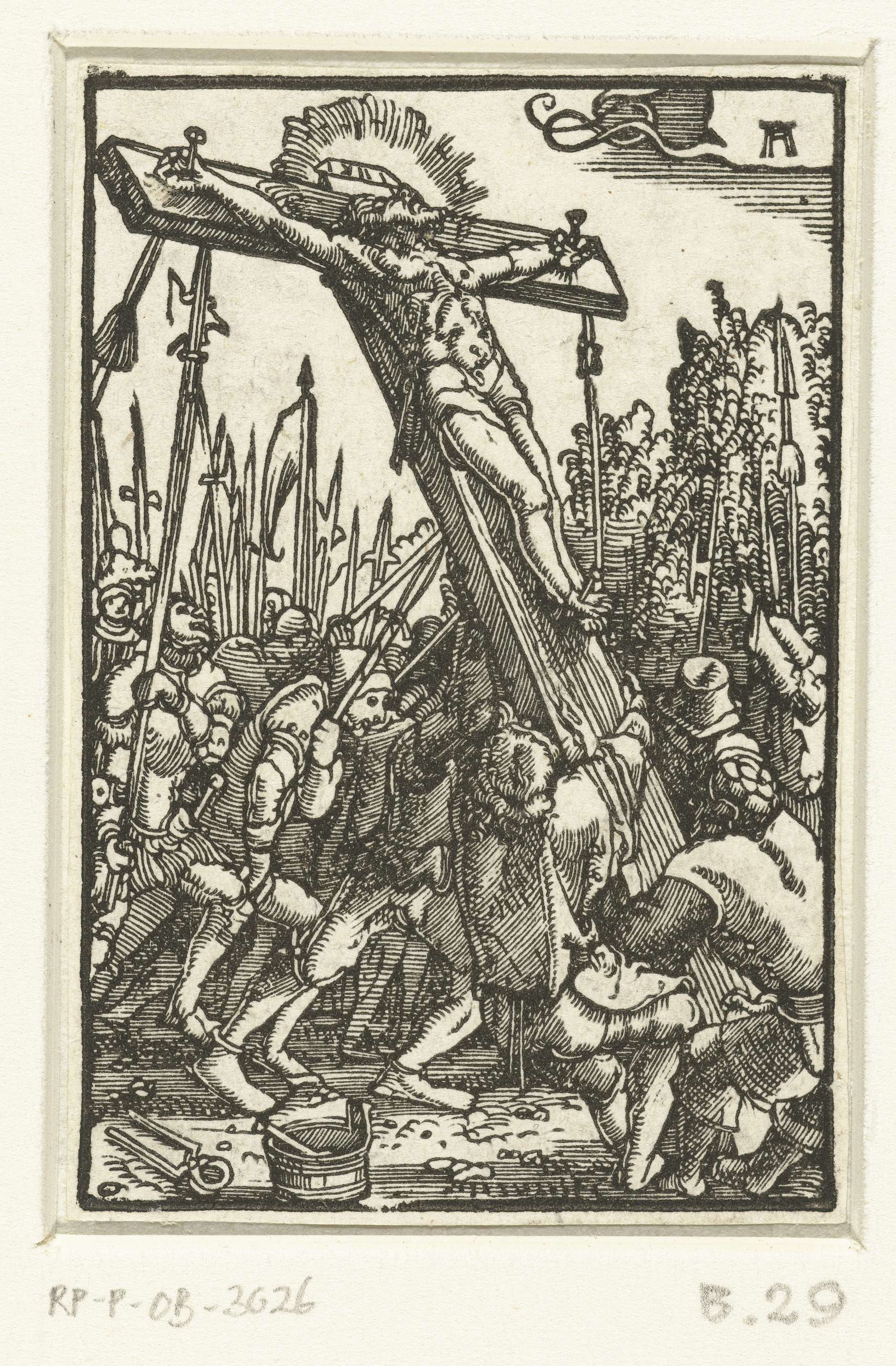 Het kruis waarop Christus is vastgenageld wordt door soldaten opgericht. Negenentwintigste prent uit een serie van veertig.