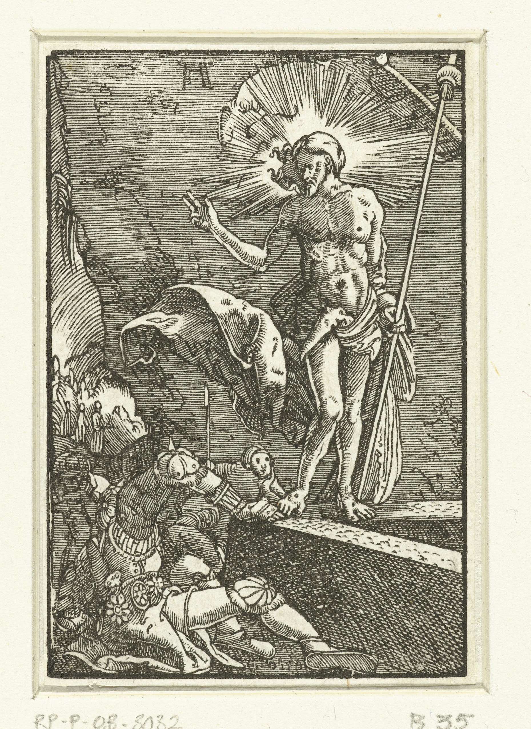 Christus staand op de rand van zijn graftombe. In de linkerhand een vaandel, met de rechterhand maakt hij een zegenend gebaar. Links wordt een soldaat wakker. Vijfendertigste prent uit een serie van veertig.