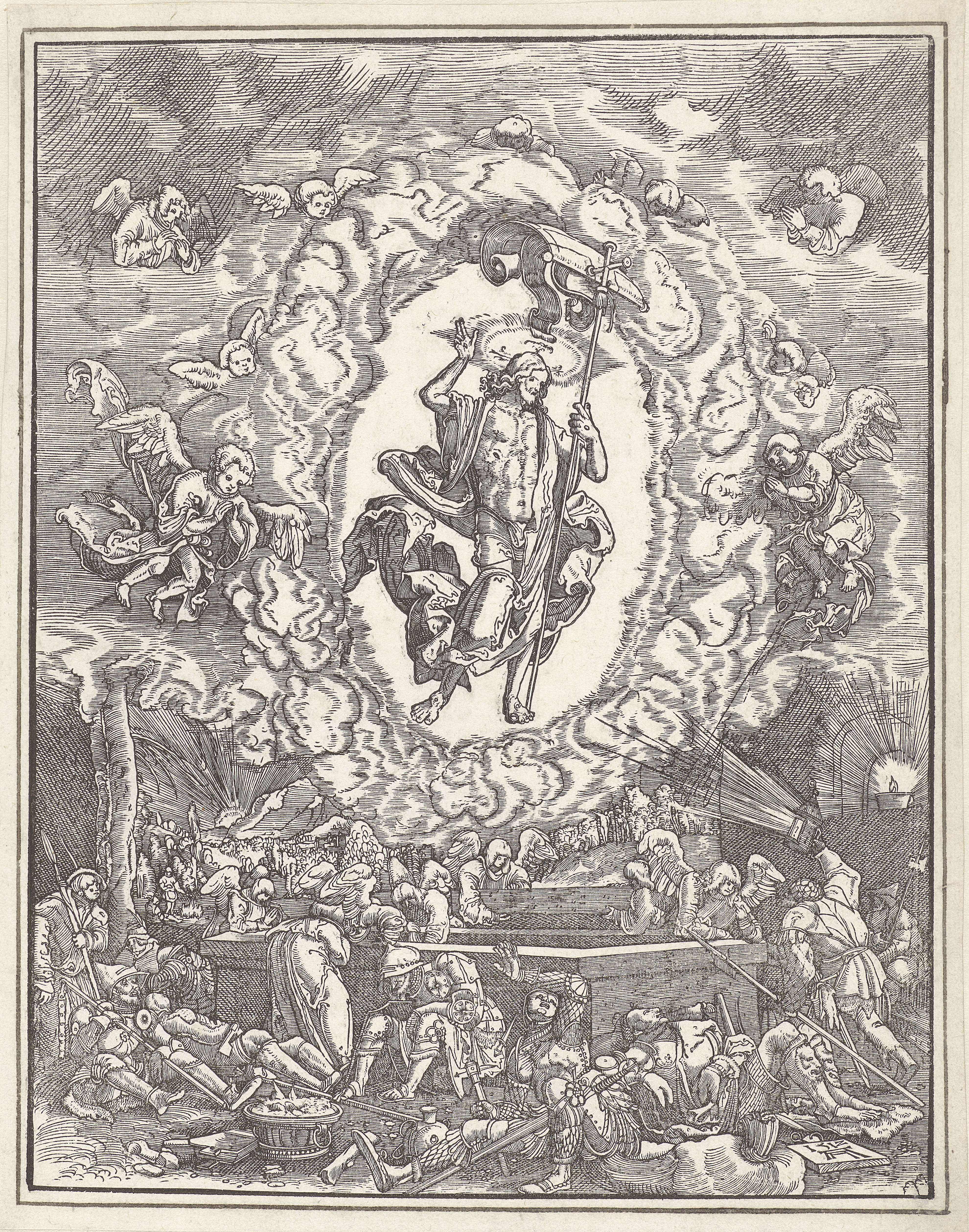 In het midden Christus in een ovaal van wolken, omringd door engelen en cherubijnen. Een vaandel in de linkerhand, met de rechterhand een zegend gebaar makend. Daaronder een aantal engelen en soldaten rond de lege graftombe.