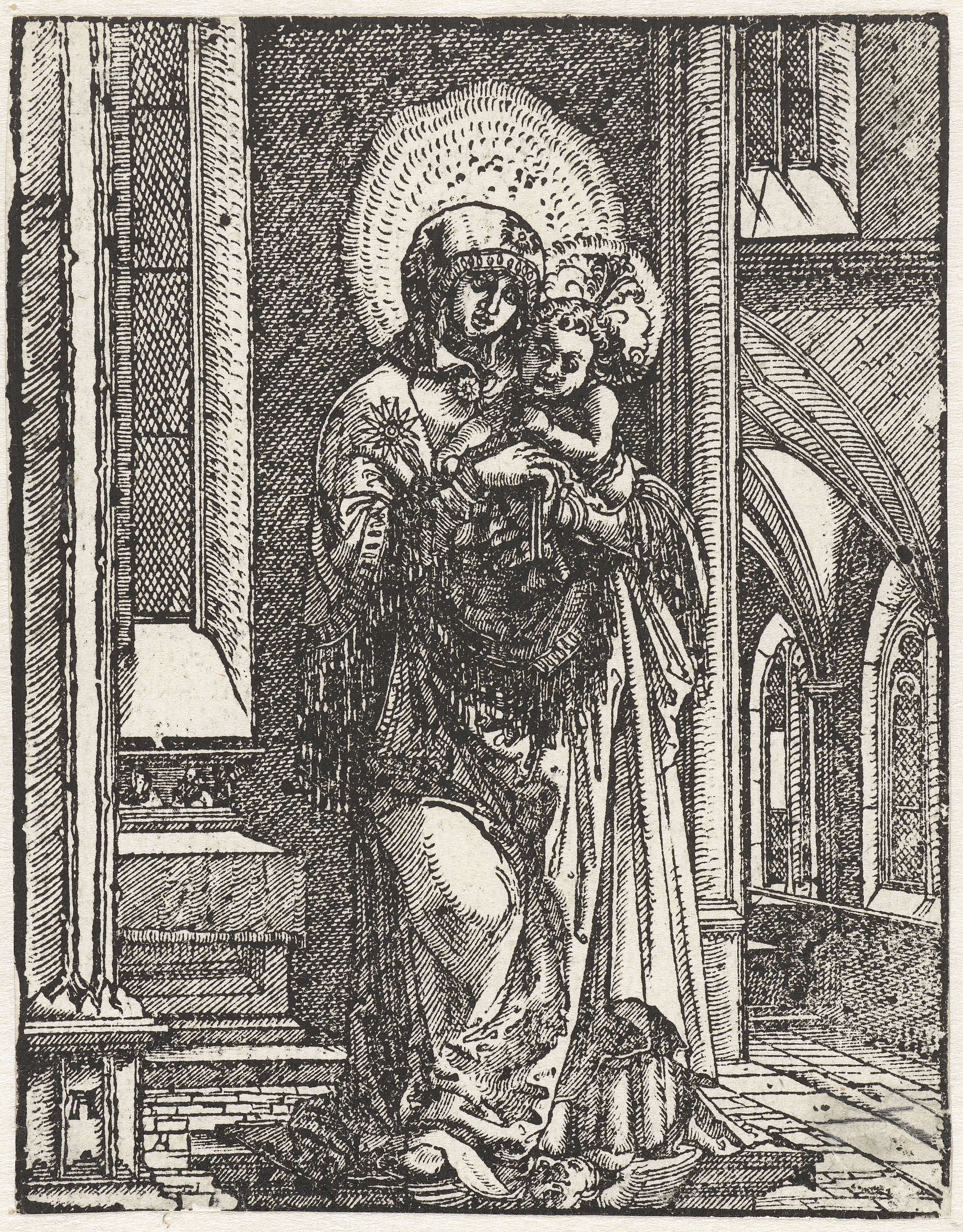 Maria met het Christuskind op haar arm, staand op een piëdestal in een gotische kerk.