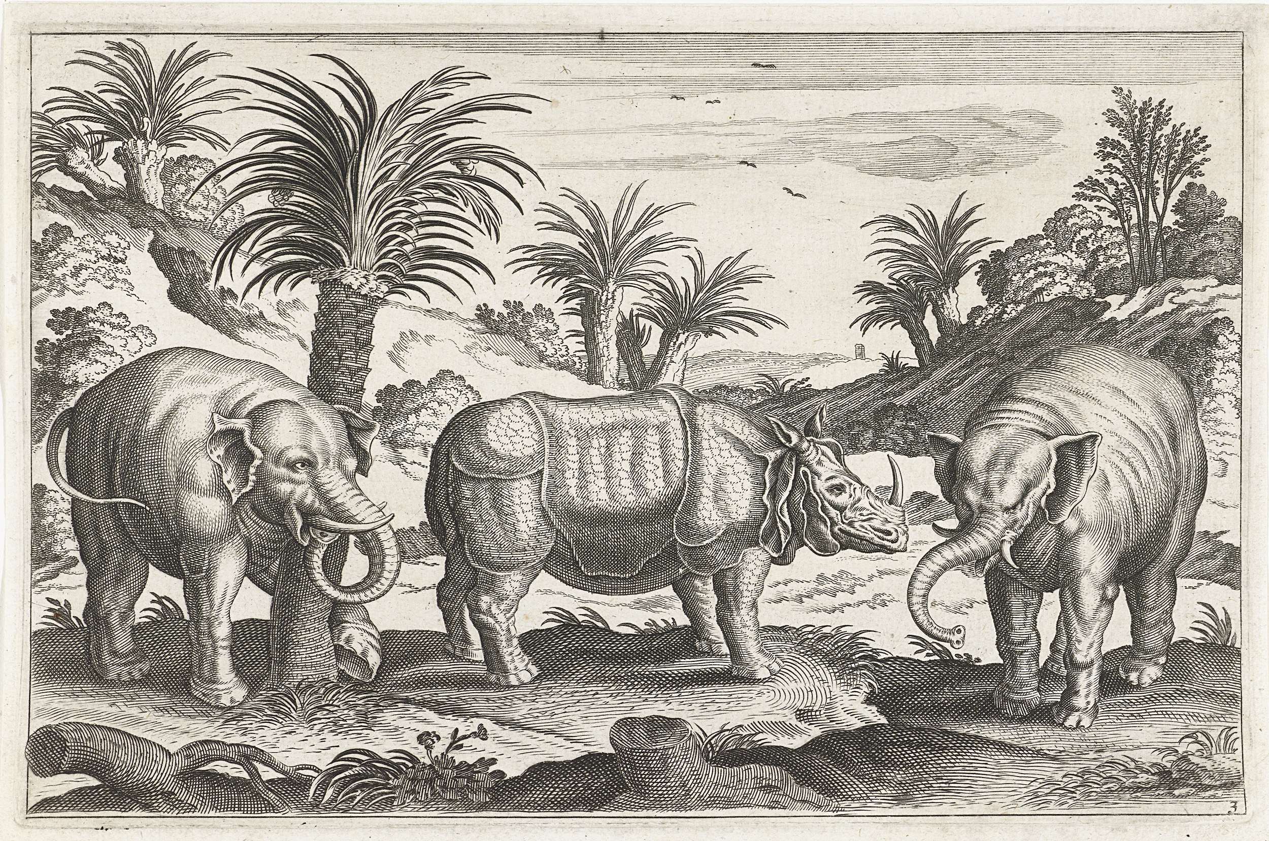 Op de voorgrond een neushoorn en twee olifanten. Op de achtergrond een landschap. De prent maakt deel uit van een serie met dieren als onderwerp.