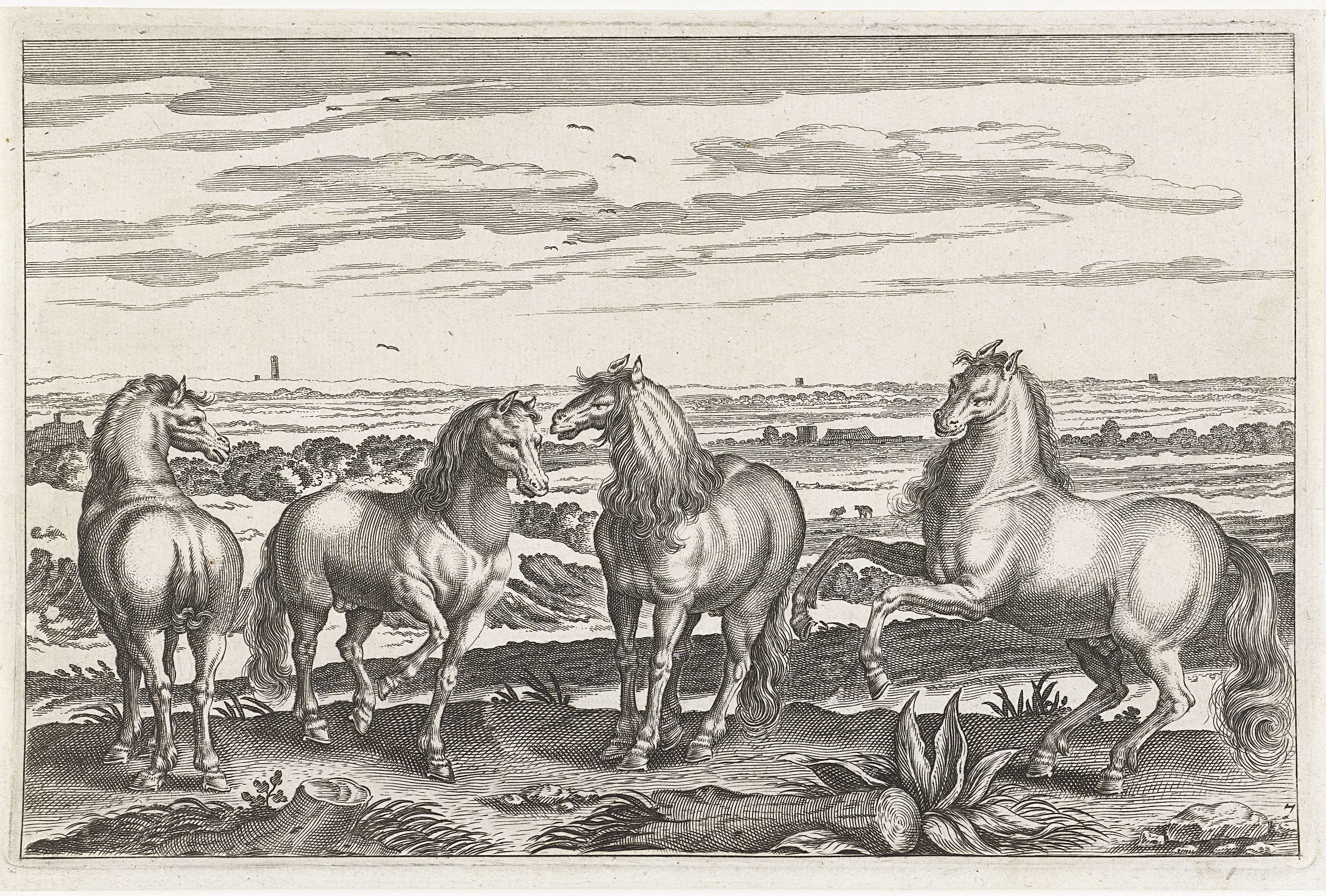 Op de voorgrond vier paarden. Op de achtergrond een landschap. De prent maakt deel uit van een serie met dieren als onderwerp.