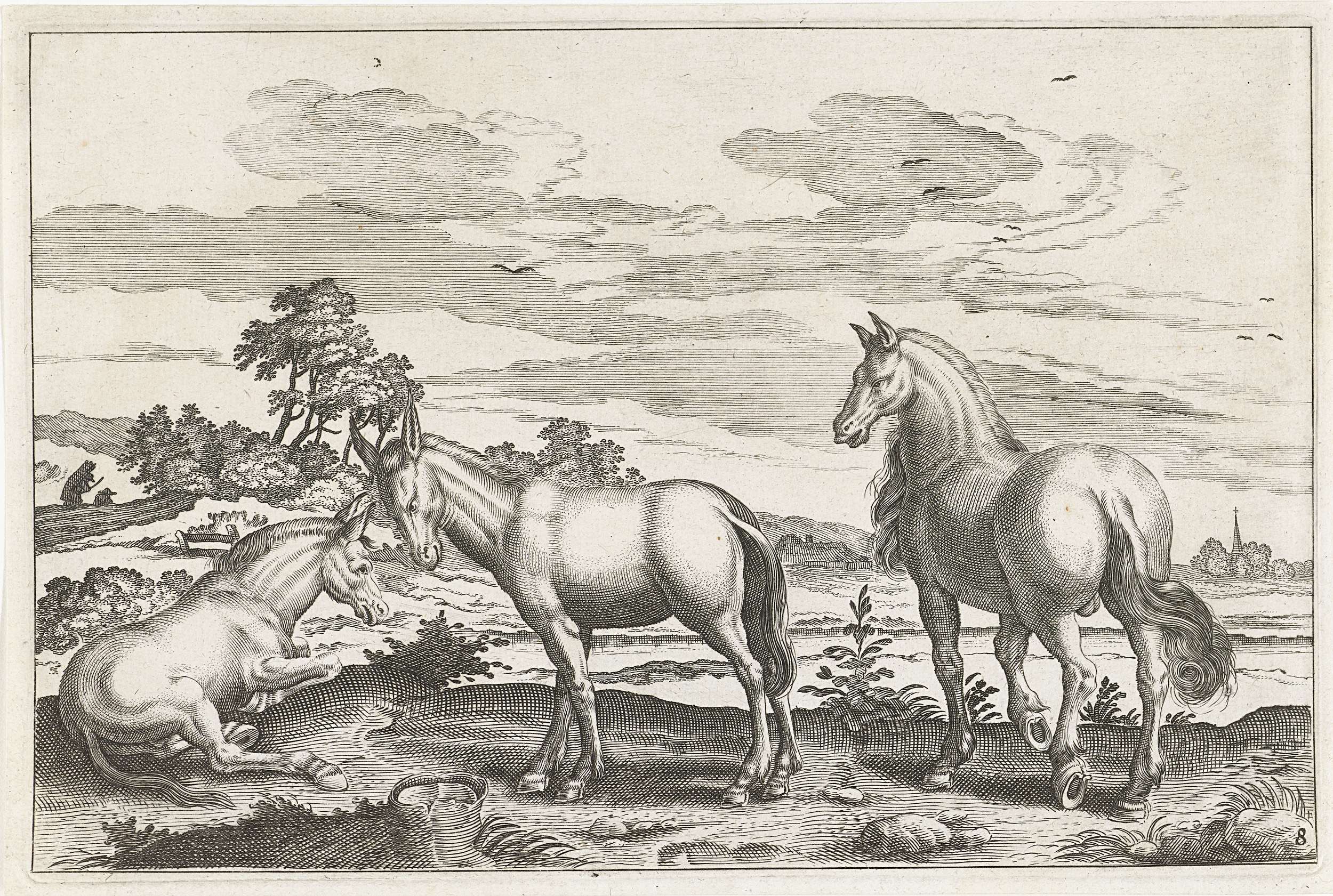 Op de voorgrond twee ezels en een paard. Op de achtergrond een landschap. De prent maakt deel uit van een serie met dieren als onderwerp.
