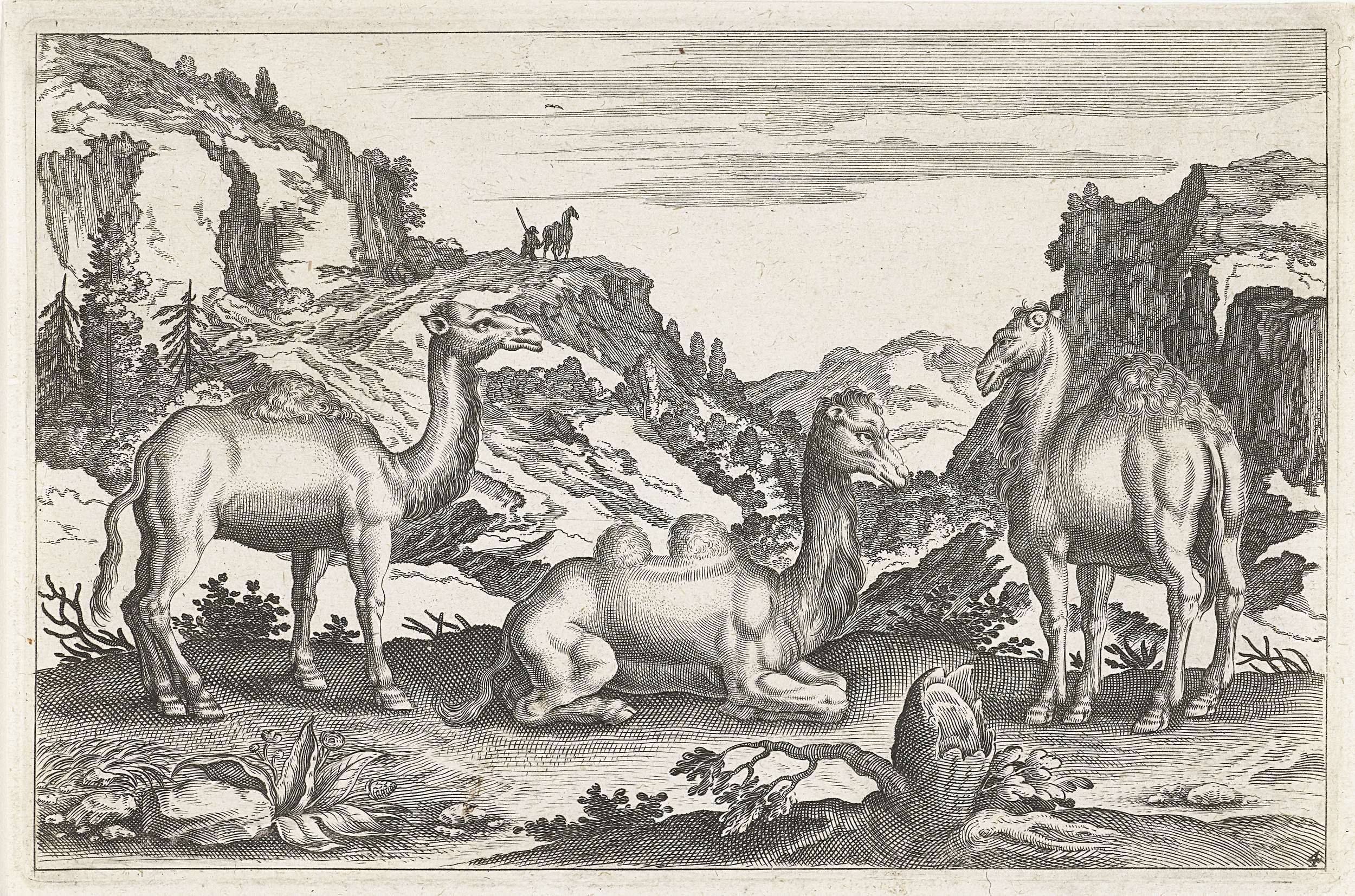Op de voorgrond twee dromedarissen en een kameel. Op de achtergrond een berglandschap. De prent maakt deel uit van een serie met dieren als onderwerp.