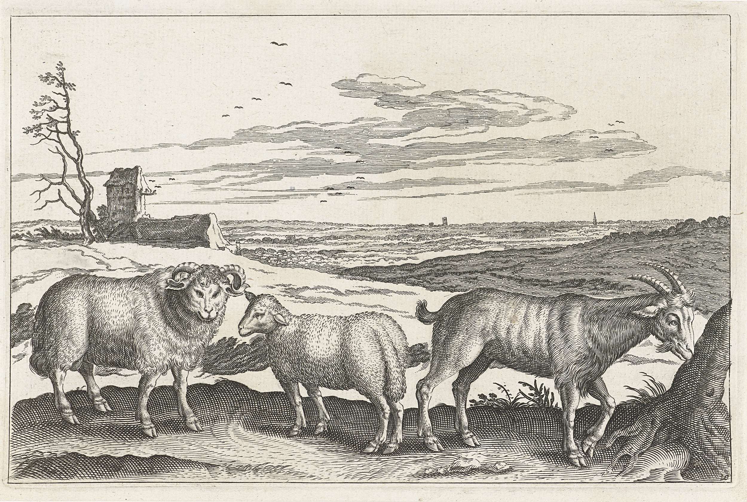 Een bok, een ooi en een ram op de voorgrond. Op de achtergrond een landschap. De prent maakt deel uit van een serie met als onderwerp dieren.