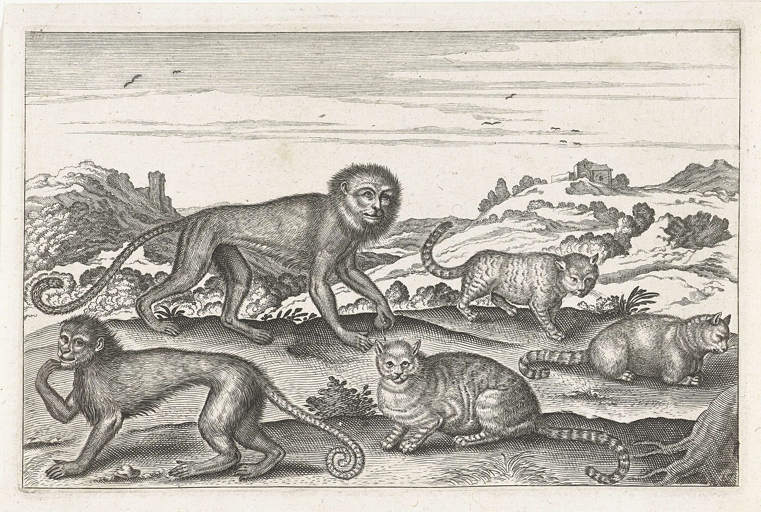 Twee apen en drie katten op de voorgrond. Op de achtergrond een landschap. De prent maakt deel uit van een serie met als onderwerp dieren.