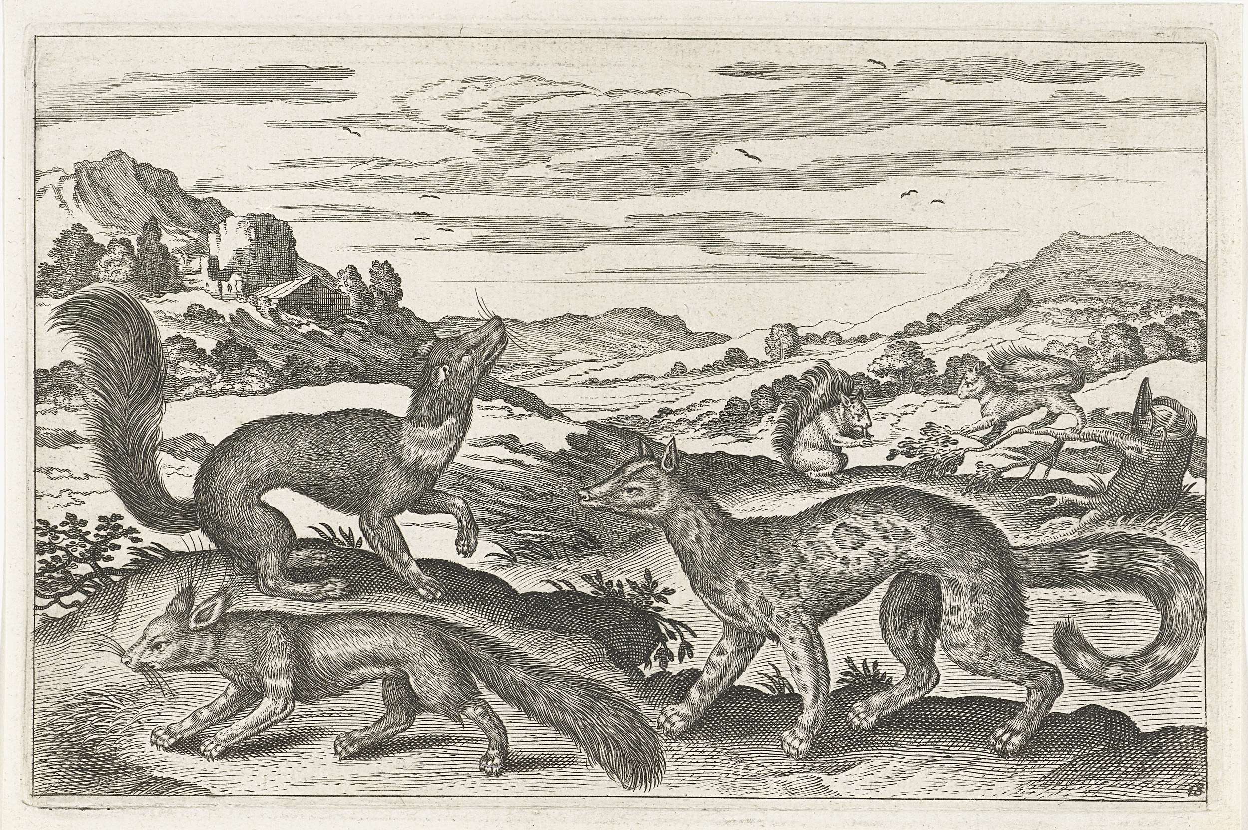 Op de voorgrond een vos, een marter en een gevlekte bunzing. Op de achtergrond een twee eekhoorn in een landschap. De prent maakt deel uit van een serie met als onderwerp dieren.