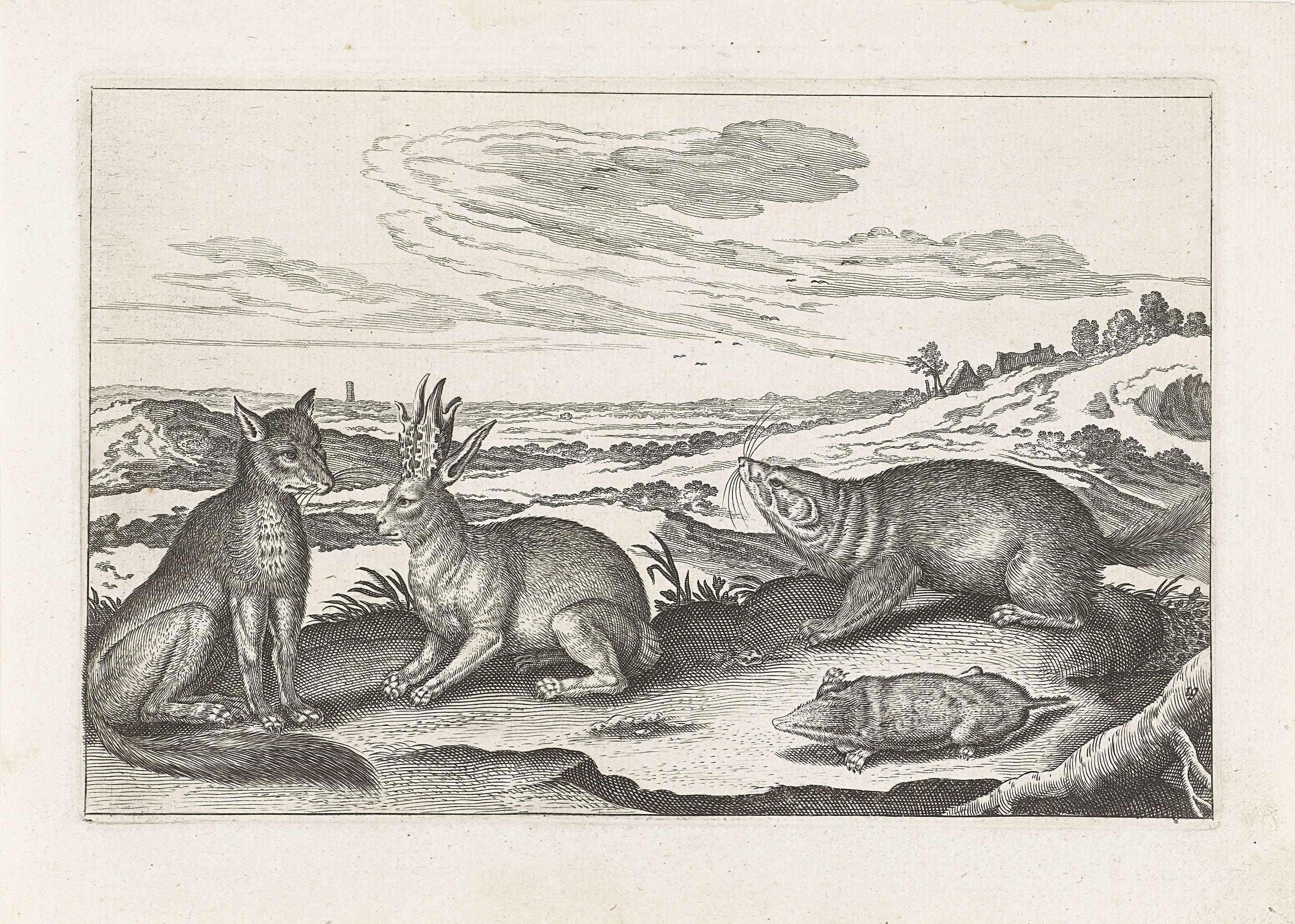 Op de voorgrond een vos, een mol, een das en een gehoornde haas. Op de achtergrond een landschap. De prent maakt deel uit van een serie met als onderwerp dieren.