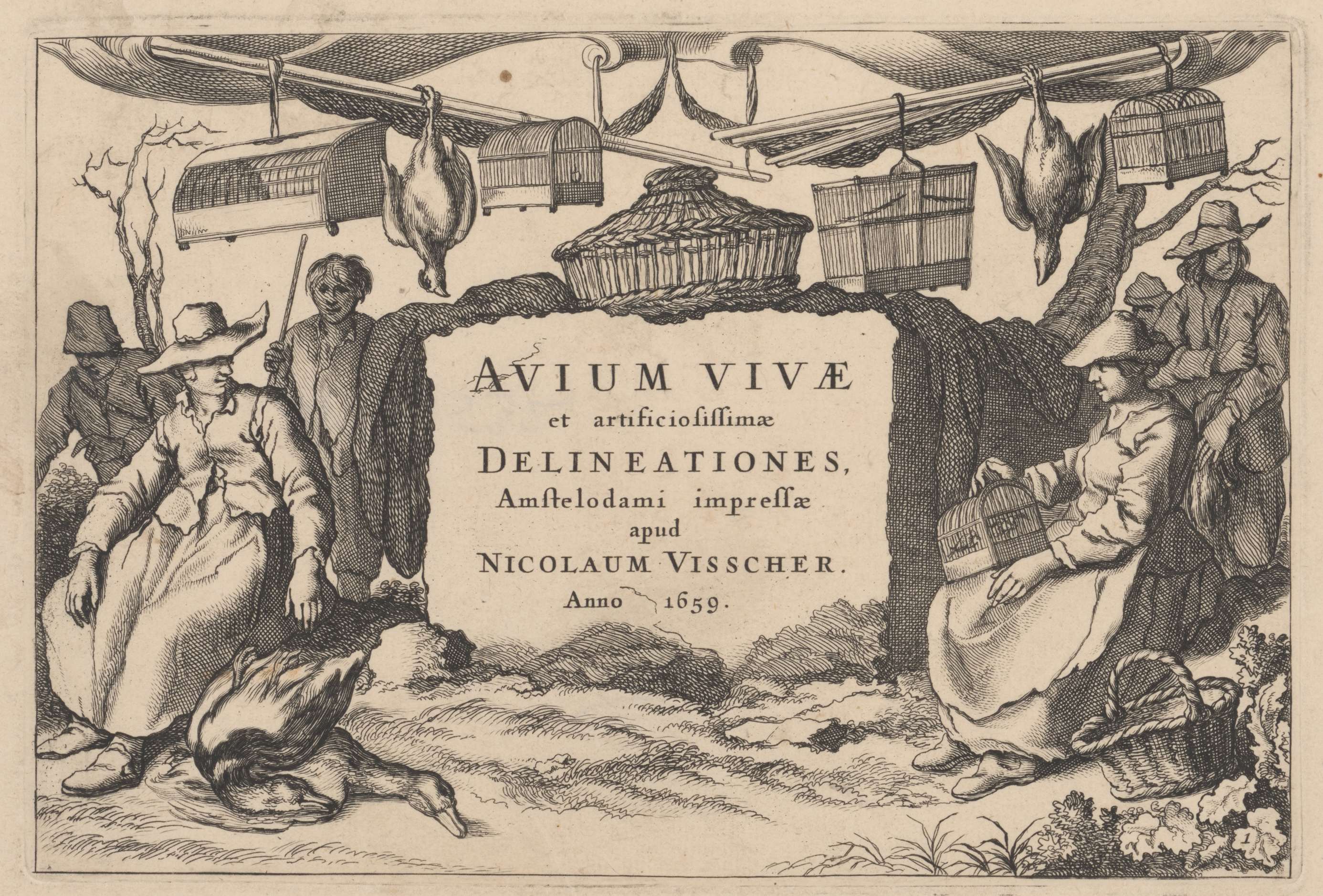 Centraal de Latijnse titel van de serie en de naam van de ontwerper en de uitgever. Rondom de titel vogelvangers en vogelverkopers. Links zit een vrouw met naast haar twee dode eenden. Rechts zit een vrouw met een vogelkooi in de handen. Deze prent is de titelprent van een serie over vogels.