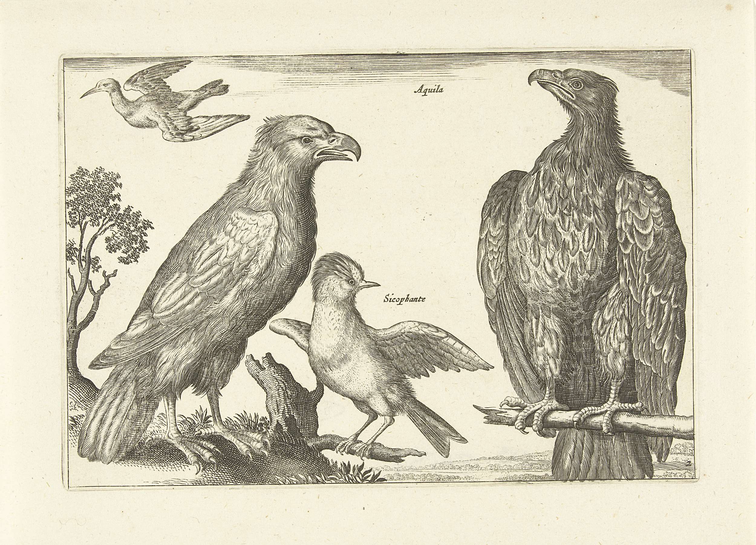 Twee adelaars, een zeevogel en een tropische vogel. De prent maakt deel uit van een serie met vogels als onderwerp.