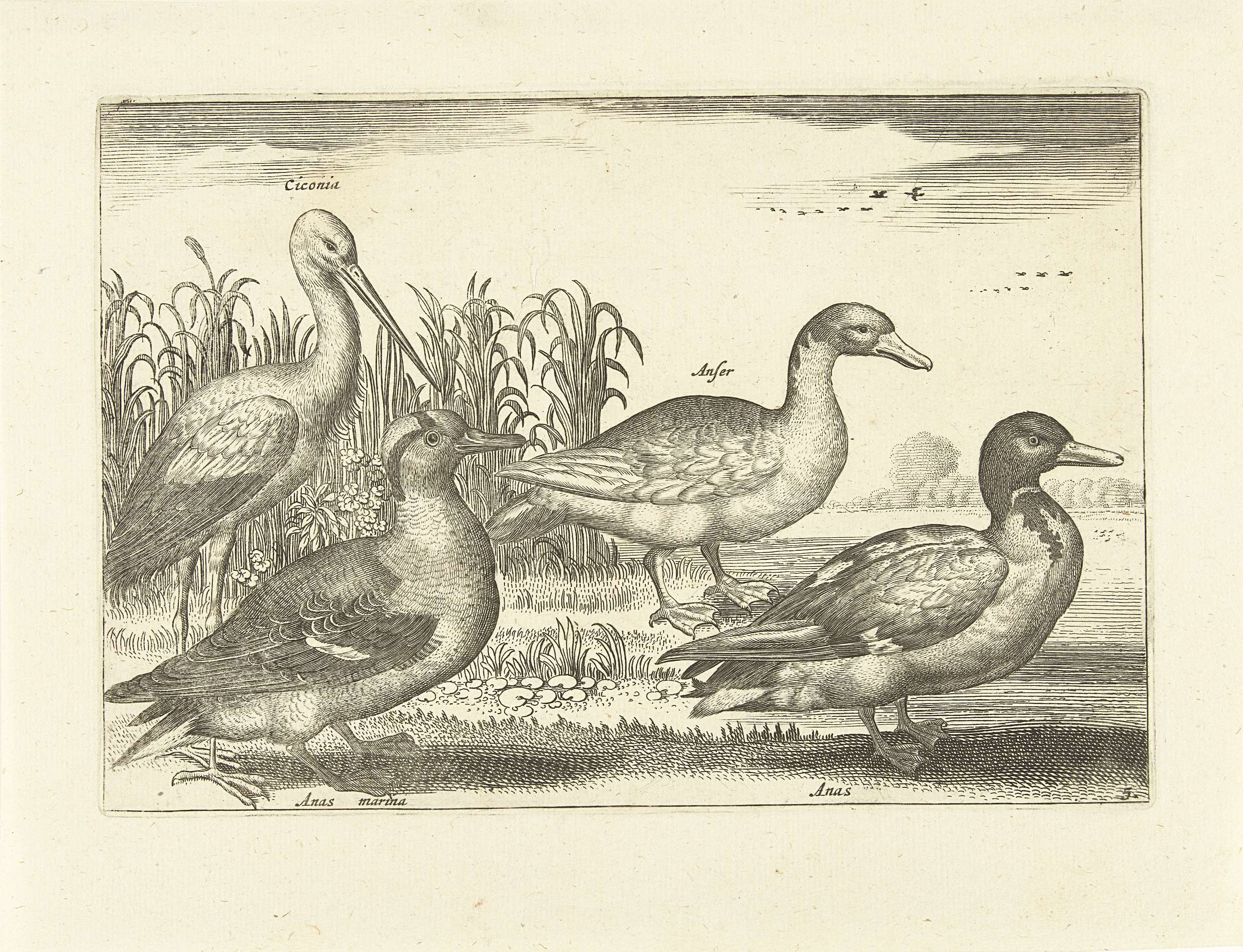 Drie eenden en een ooievaar in het riet. De prent maakt deel uit van een serie met vogels als onderwerp.