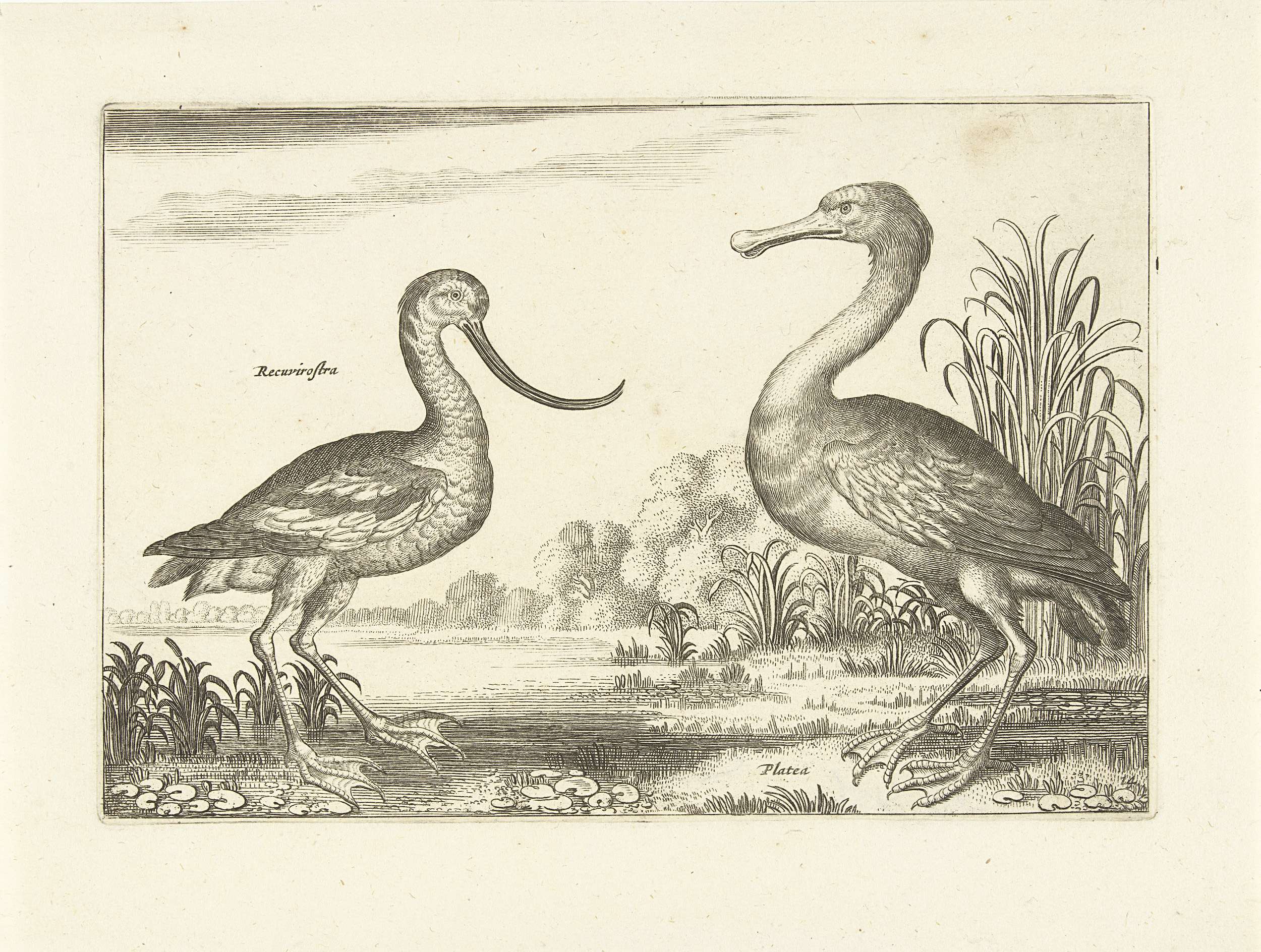 Een lepelaar en een kluut op de voorgrond. Op de achtergrond een rivierlandschap. De prent maakt deel uit van een serie met vogels als onderwerp.