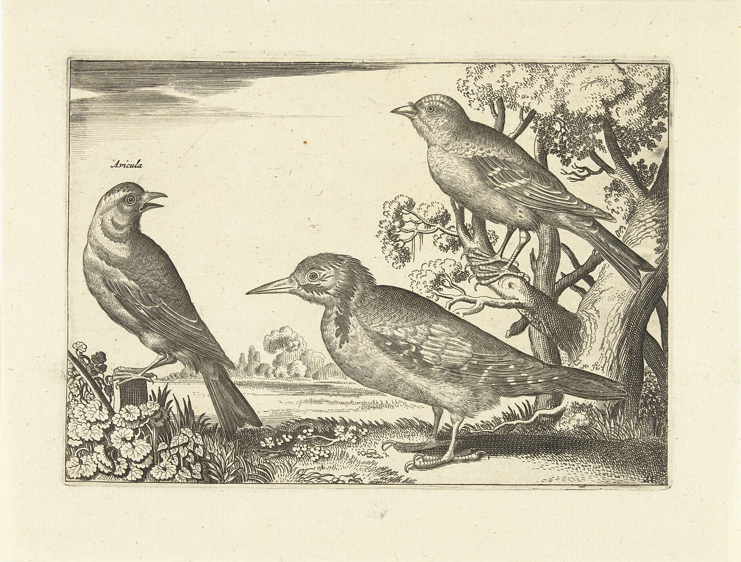 Twee mussen en een grote bonte specht. De prent maakt deel uit van een serie met vogels als onderwerp.